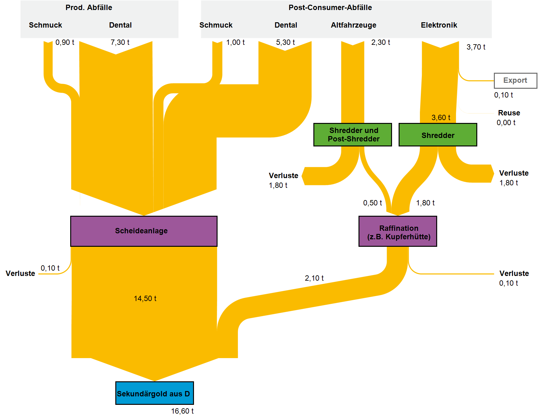 Goldhaltige Schrotte aus Elektroaltgeräten sowie Altautos werden aufbereitet und gelangen in die Kupferraffination, wo Gold genauso wie Silber und weitere Edelmetalle elektrolytisch aufkonzentriert und abgeschieden wird.