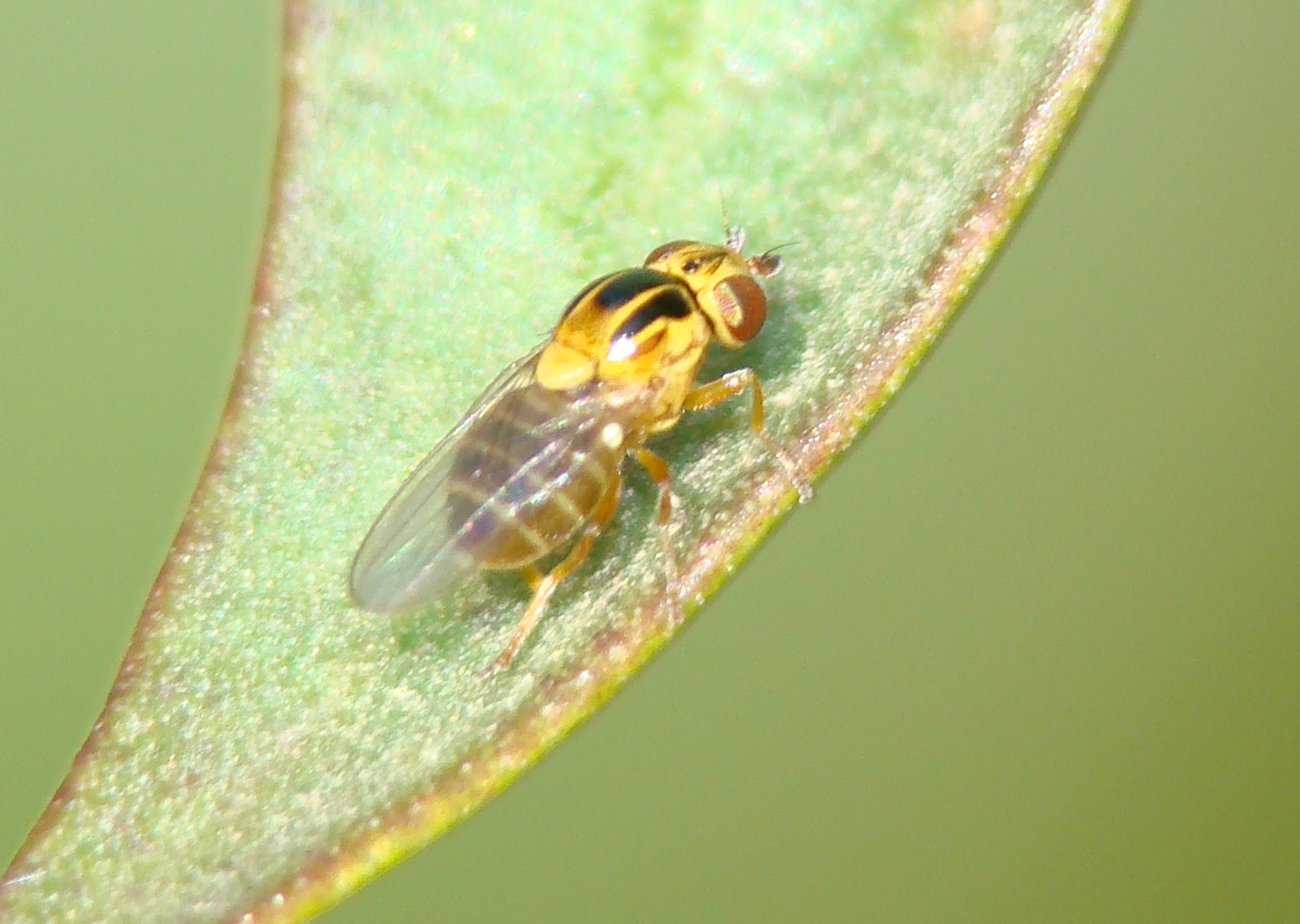 zum Vergrößern anklickenHalmfliegen sind kleine, nur etwa 2 mm lange, gelbglänzende Fliegen mit drei schwarzen Längsstreifen auf der Brustoberseite und grünen Augen.