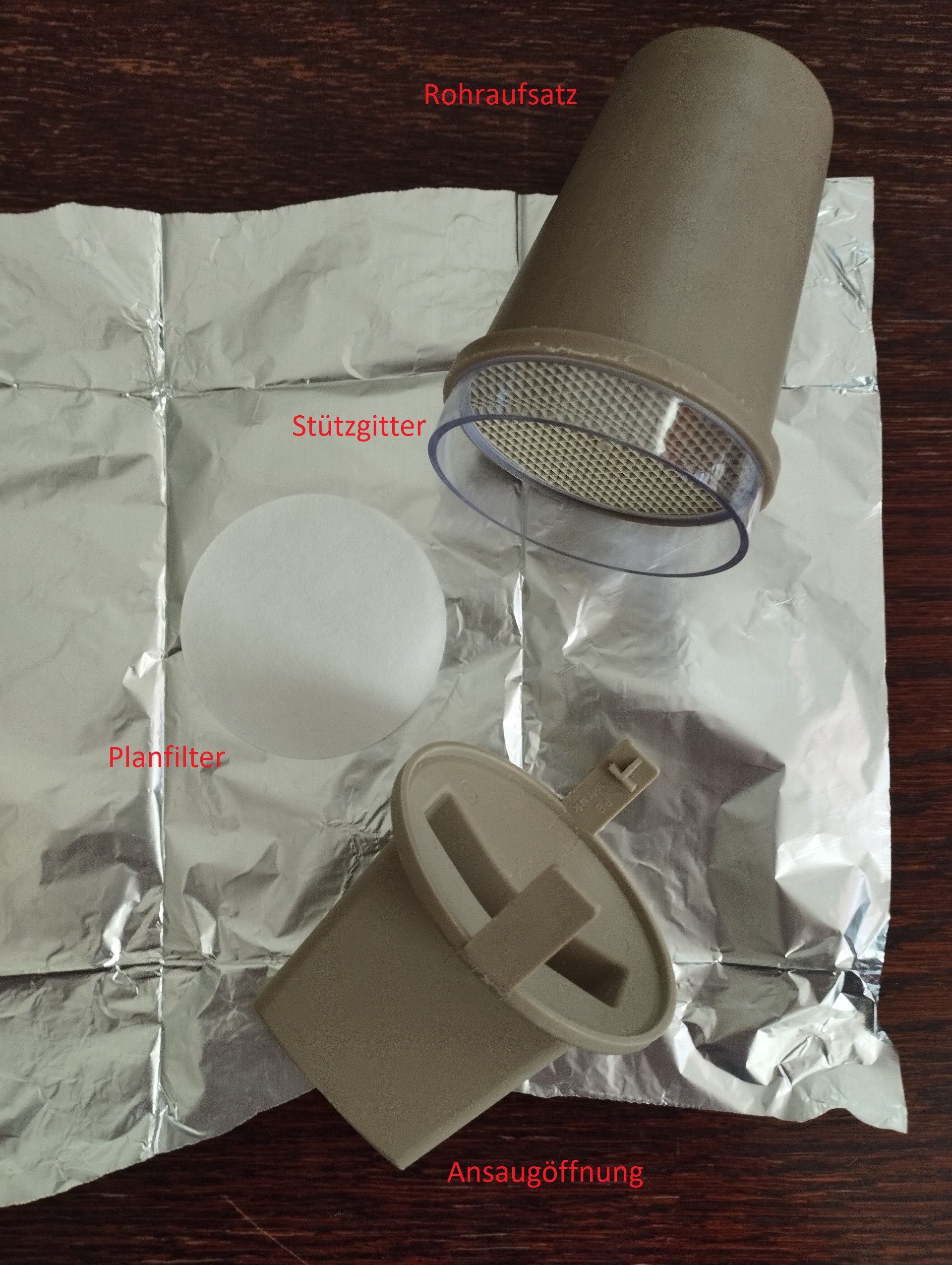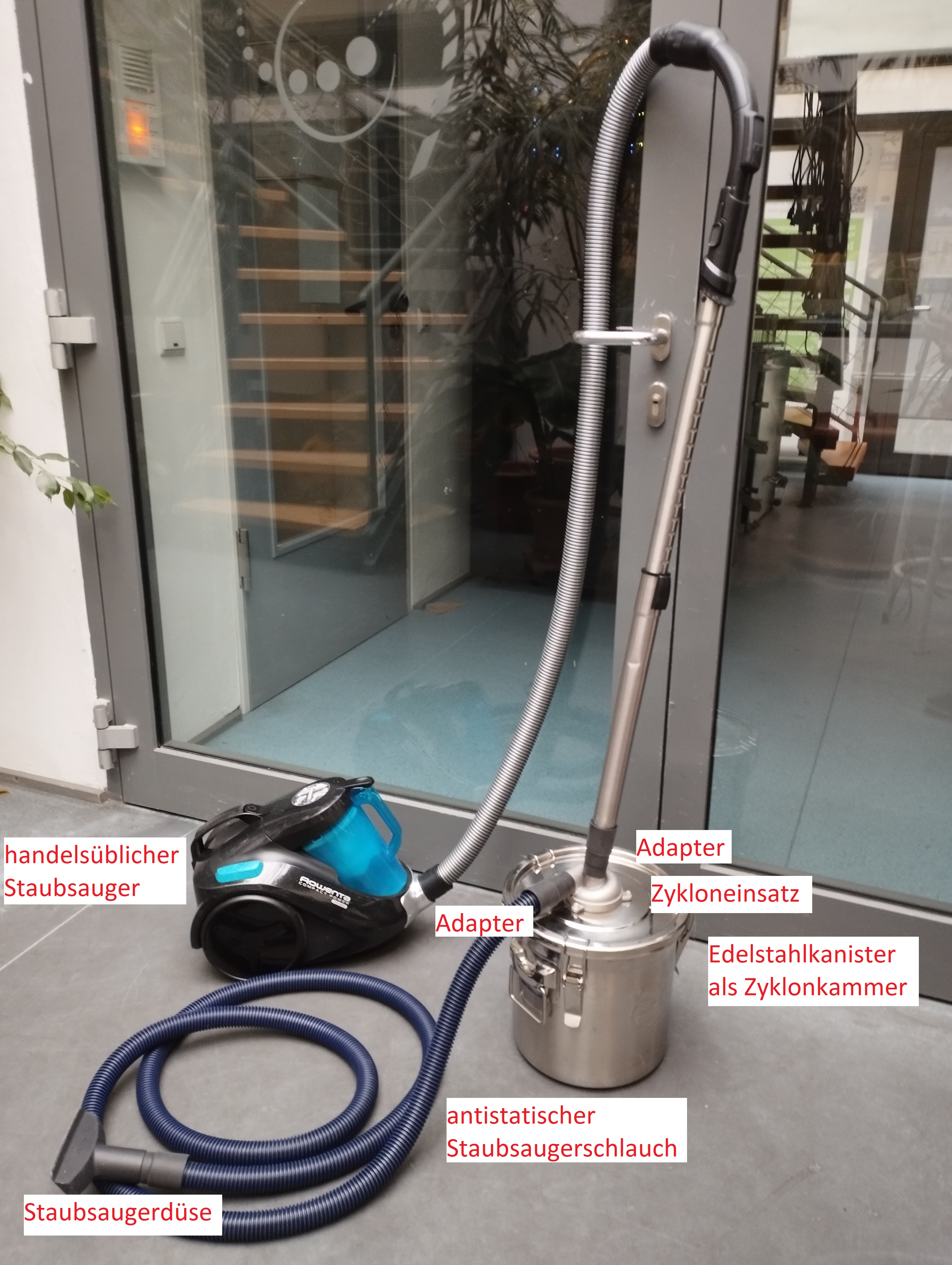 Die zyklonbasierten Staubsaugersysteme zeigen eine den anderen Probenahmesystemen überlegene Wiederfindung des Teststaubs auf den standardisierten Testaufbauten für glatten Boden und Teppich. Dieses trifft besonders auf Teppich zu. Gleichzeitig sind die Zyklonkammern der käuflichen Systeme, in denen die Staubprobe gesammelt wird, nur unzureichend zu reinigen. Dies ist dem komplexen Aufbau der Zyklonsysteme und der Ausführung aus Plastik, die zu Aufladungseffekten und folgend statischer Bindung feiner Staubpartikel an den Wandungen führt, geschuldet. Deshalb kann eine Kontamination von aufeinanderfolgenden Proben nicht ausgeschlossen werden. Die Bremer Umweltinstitut GmbH entwickelte daher ein zyklonbasiertes Probenahmesysten, das aus Metall ausgeführt und leicht zu reinigen sein sollte. Weiterhin sollte es mit unterschiedlichen Staubsaugern einsetzbar sein. Abb. zeigt den Prototyp dieses Systems. Er besteht aus folgenden Komponenten: