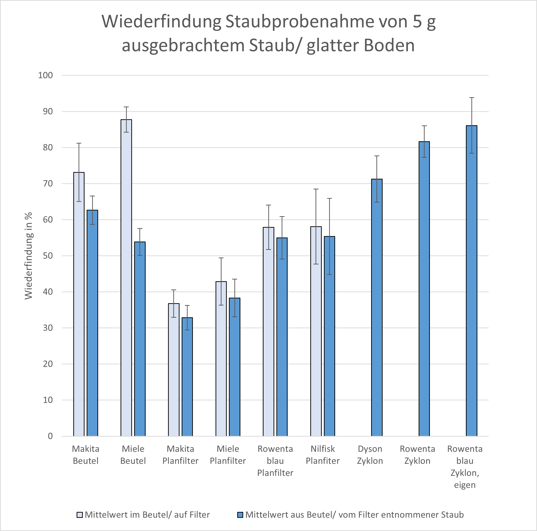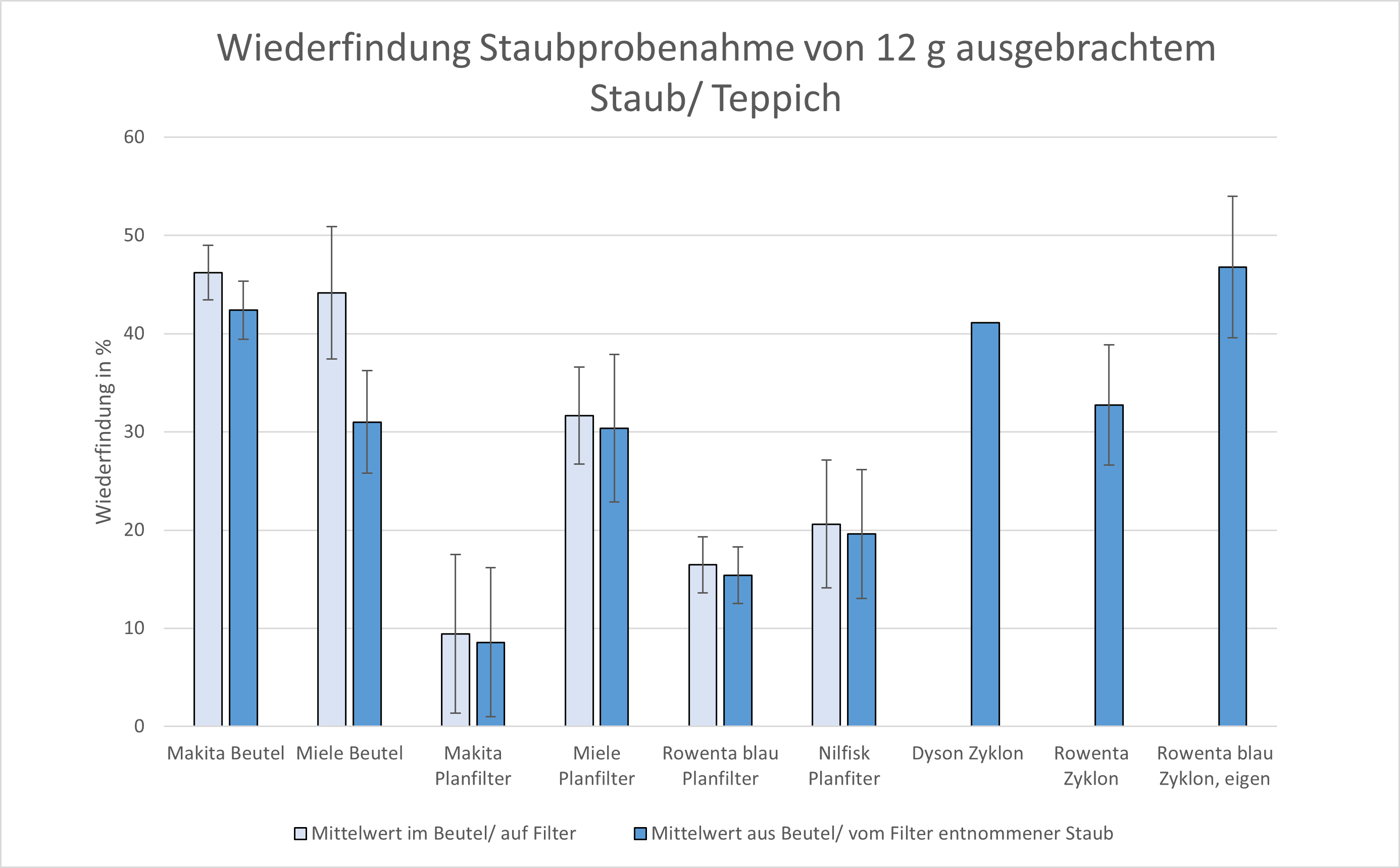 die Wiederfindung im Staubsaugerbeutel oder auf dem Planfilter, die aus der Differenz des Gewichts des Staubsaugerbeutels oder Planfilters nach der Probenahme und vor der Probenahme berechnet wird (hellblauer Balken). Die Staubsauger sind jeweils nach aufsteigender Leistungsaufnahme angeordnet. Die Wiederfindungseffizienz im Staubsaugerbeutel bzw. auf dem Planfilter ist allerdings eine andere, als die Wiederfindungseffizienz des Staubes, der wirklich der Analytik zugänglich gemacht werden kann, da immer ein Anteil des Staubes im Material des Staubsaugerbeutels hängen bleibt. Dieses trifft besonders für den zweilagigen Staubsaugerbeutel des Miele H1 Staubsaugers zu. Daher wird als zweiter Wert die Wiederfindung des Staubs, der aus dem Staubsaugerbeutel oder vom Filter entnommen werden kann, dargestellt (dunkelblauer Balken). Bei dem Dyson V 10 Absolute, dem Rowenta Swift Power Cyclonic und dem Zyklon-Eigenbau der Bremer Umweltinstitut GmbH gibt es aus praktischen Gründen den ersten Wert nicht.
