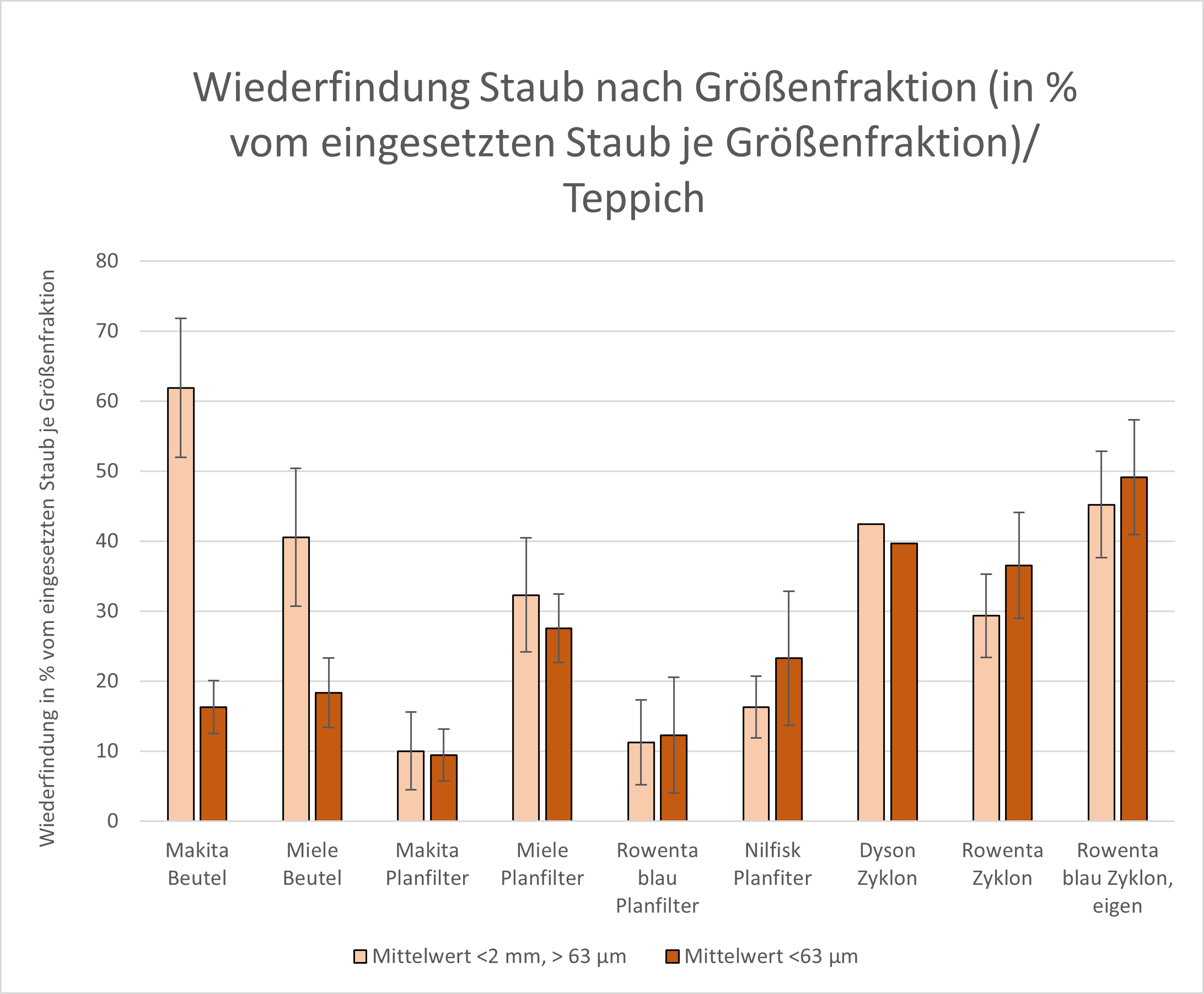 Die Abbildungen 5 und 6 zeigen die analogen Ergebnisse der Staubwiederfindung von Teppichboden. Abb. 5 zeigt die Wiederfindung des Staubs im Staubsaugerbeutel und auf dem Planfilter (hellblaue Balken) und die Wiederfindung, wenn nur der entnehmbare Staub betrachtet wird (dunkelblaue Balken). Die Staubsauger sind jeweils nach aufsteigender Leistungsaufnahme angeordnet. Abb. 6 zeigt die Wiederfindung in den zwei Größenfraktionen < 2 mm, > 63 µm (hell-oranger Balken) und < 63 µm (dunkel-oranger Balken).