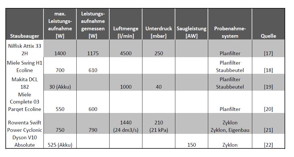 Da viele Beprobungssysteme mit Hilfe eines handelsüblichen Staubsaugers funktionieren, wurde eine umfassende Recherche zu Leistungsparametern von Staubsaugern, insbesondere von derzeit auf dem Markt erhältlichen, durchgeführt.