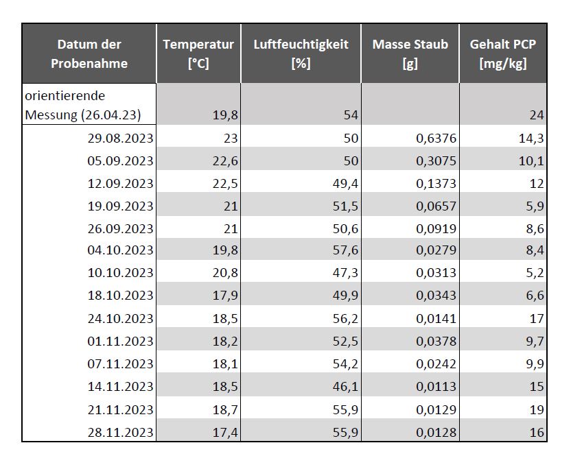 Vom Glasfaserfilter werden bei der Bremer Umweltinstitut GmbH im Labor größere Partikel und Haare entfernt, die Filter zurückgewogen und der Staub auf die Zielparameter PCP und Lindan mittels GC-ECD (Gaschromatographie mit Elektroneneinfangdetektor) hin analysiert. Hierbei werden die Glasfaserfilter mit extrahiert, da ein Großteil der feinen Staubfraktion in den Filtern festhängt. In Tabelle 2 finden sich die Daten Staubmenge, Temperatur und Luftfeuchtigkeit der Probenahmen ab dem 29.08.2023 im Magazin 9 des Hauptgebäudes. Es liegen bisher die Ergebnisse der Analytik des Zielparameters PCP für die Termine bis zum 28.11.23 vor. In der ersten Zeile der Tabelle 2 ist der Wert der orientierenden Messungen dargestellt.