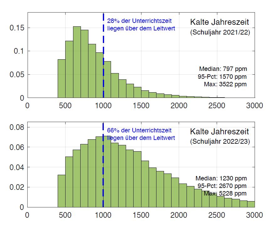 Im Winter 2021/22 (Pandemiejahr) wurde während 28% der Unterrichtszeit der Leitwert von 1000 ppm überschritten; der Median lag bei 797 ppm, das 95% Perzentil der CO2-Verteilung bei 1563 ppm. Im Winter 2022/23 (Post-Pandemiejahr) wurde während 66% der Unterrichtszeit der Leitwert von 1000 ppm überschritten; der Median lag bei 1230 ppm, das 95% Perzentil der CO2-Verteilung bei 2670 ppm. Diese Ergebnisse zeigen eine deutliche Verschlechterung im Post-Pandemiejahr im Vergleich zum Pandemiejahr, was durch eine Veränderung des Lüftungsverhaltens erklärbar ist.