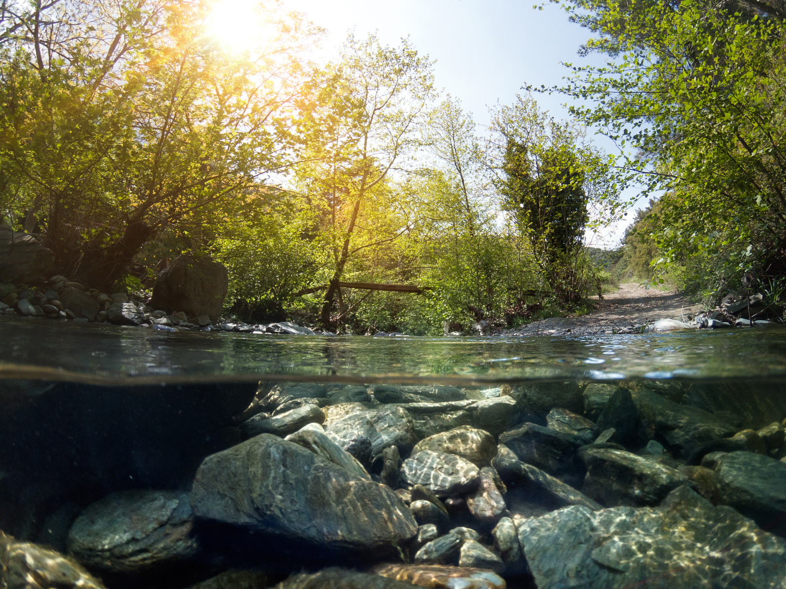Foto: Ein steiniges, teils von Wasser überflossenes, teils mit Moos überwachsenes Gewässerbett. Im Vordergrund steht ein Glas mit Sprudelwasser auf einem im Gewässer befindlichen Stein, das die Trinkwasserversorgung symbolisiert.