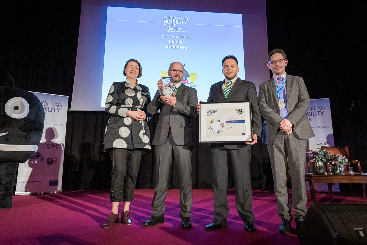 Die Stadt Lindau am Bodensee konnte sich als erste deutsche Kommune überhaupt über diesen Preis freuen. Die Jury lobte insbesondere, wie die Stadt das EMW-Motto 2018 Multimodalität umsetzte. Während der EMW konnten sich Bürgerinnen und -Bürger über die vielfältigen nachhaltigen Mobilitätsangebote in der Stadt informieren und einige auch gleich ausprobieren – vom Wasser-Taxi über die neuen Radabstellanlagen bis zum Hybrid-Bus war alles dabei. Eine neue App erleichtert zudem das Planen multimodaler Routen. Darüber hinaus gab es ein Pendlerfrühstück für diejenigen, die mit dem Rad, dem ÖPNV oder zu Fuß unterwegs waren. Neben Lindau waren Karditsa (Griechenland) und Oliveira do Bairro (Portugal) nominiert.