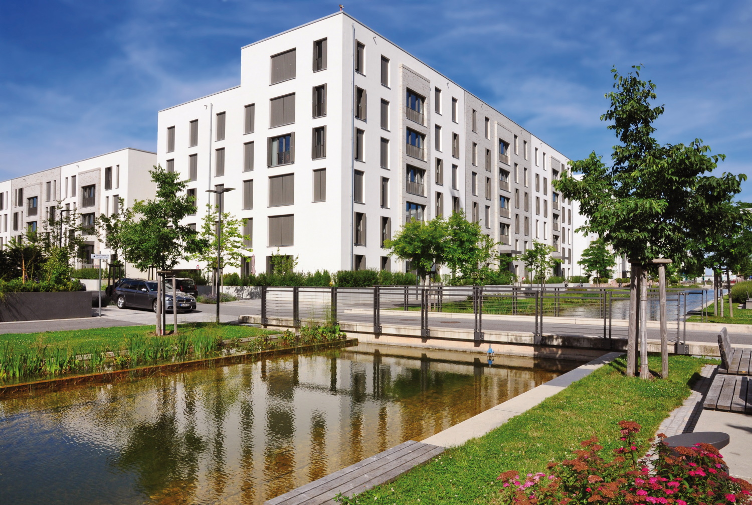 Das Bild zeigt einen künstlichen Wasserlauf, der in einem neu entwickelten Quartier an einem Geschosswohnungsbau vorbeifließt. Eine Straße quert den Wasserlauf. Der Wasserlauf ist von einem schmalen Grünstreifen mit Rasen, jungen Bäumen und Blumenbeeten eingefasst. Bänke bieten Sitzmöglichkeiten.