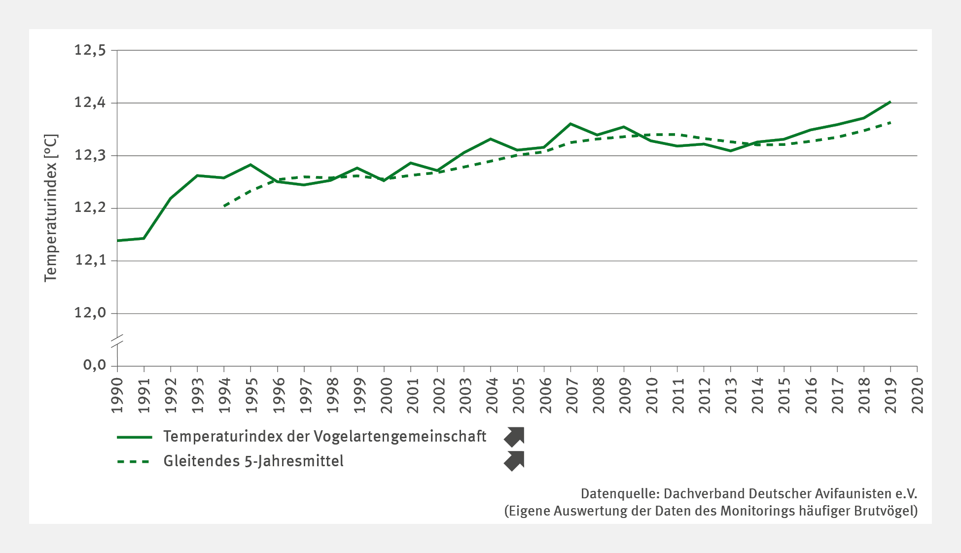 In den Jahren 1990 bis 2019 lässt sich eine solche Entwicklung anhand von 88 in Deutschland häufig vorkommenden Brutvogelarten beobachten. In diesem Zeitraum haben sich – wie der Temperaturindex häufiger Brutvogelarten zeigt – die relativen Häufigkeiten der betrachteten Vogelarten zu Gunsten wärmeliebender Arten beziehungsweise zu Ungunsten kältetoleranter Arten verschoben. Die Entwicklung des gleitenden 5-Jahresmittels des Temperaturindex zeigt seit 1994 zunächst einen Anstieg bis ungefähr 2010, danach eine leicht rückläufige Entwicklung bis 2013, auf die wiederum ein deutlicher Anstieg folgte. Die Entwicklung zwischen 2010 und 2013 lässt sich zunächst auf Witterungseinflüsse zurückführen, die unabhängig vom langfristigen klimatischen Trend wirkten. Von 2009/2010 bis 2012/13 gab es eine Reihe strenger Winter in Folge mit negativen Auswirkungen auf die Bestände vieler Brutvögel. Die Entwicklungen seit 2013 zeigen, dass der längerfristig positive Trend des Indikators trotz kurzfristig nivellierender Effekte durch die genannten Winter zwischen 2009 und 2013 fortbesteht. Es wird aber auch deutlich, dass dem Auftreten von Witterungsextremen für ökologische Veränderungsprozesse auch bei fortschreitender klimatischer Erwärmung eine große Bedeutung zukommt.