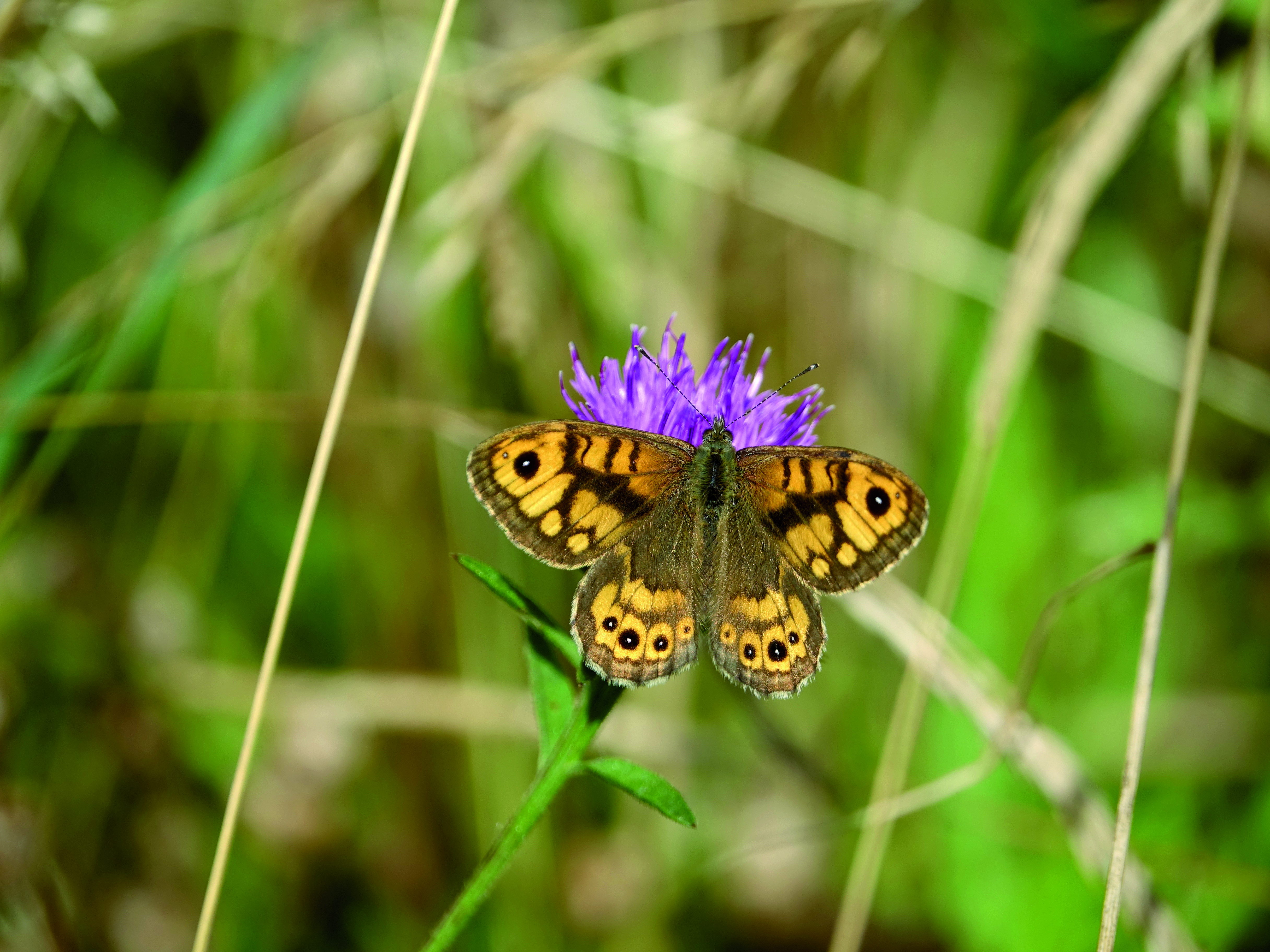 Das Bild zeigt einen Mauerfuchs, der auf einer violetten Blüte sitzt und die Flügel ausbreitet