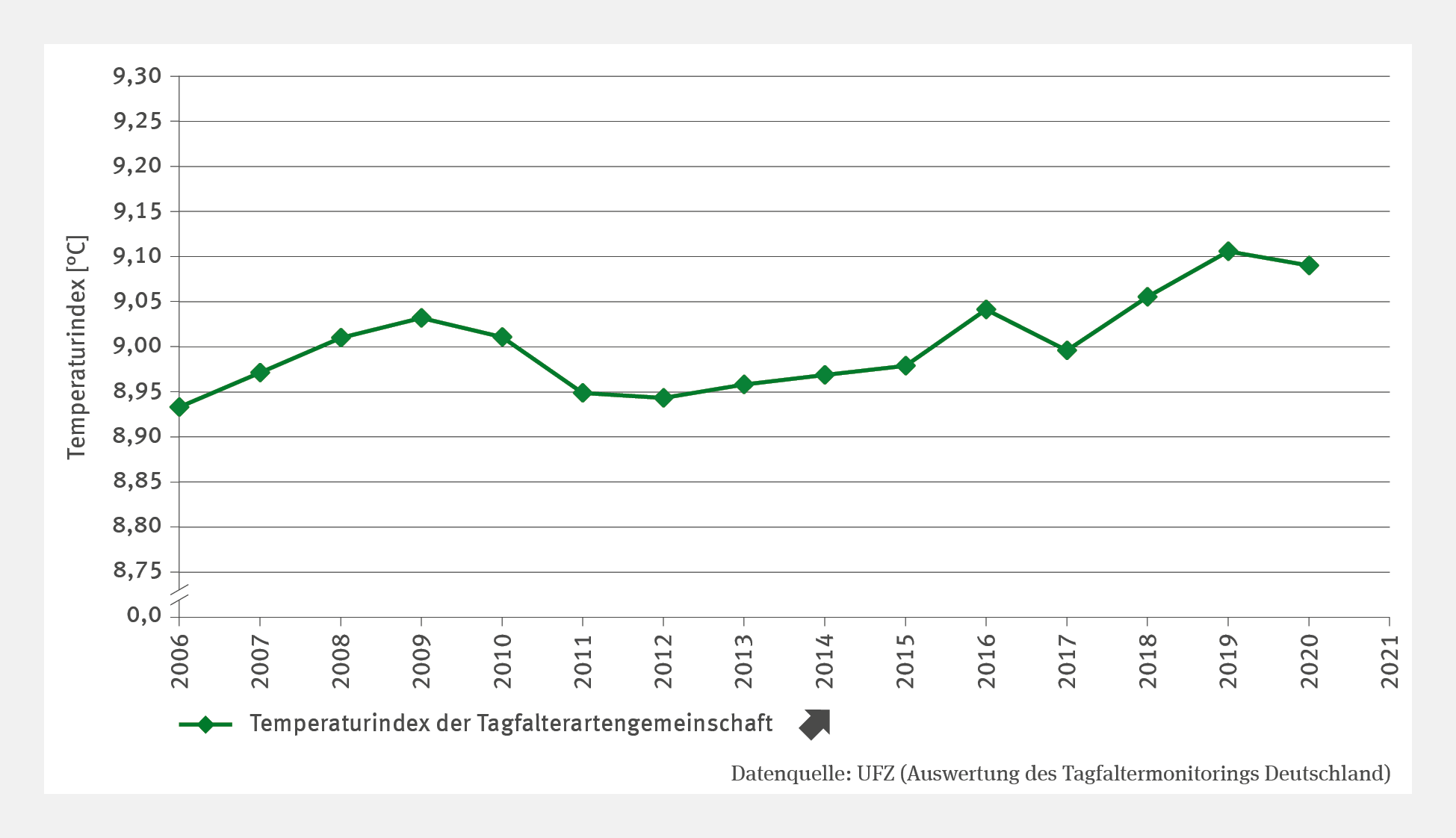 Die Abbildung BD-I-3 "Temperaturindex der Tagfalterartengemeinschaften" zeigt ein Liniendiagramm des Temperaturindex in °C von 2006 bis 2021. Der Index stieg signifikant von 8,9 °C im Jahr 2006 auf 9,1 °C im Jahr 2021. Der Anstieg verlief jedoch nicht kontinuierlich: Rückgänge gab es 2010, 2011 und 2017. Der Index verdeutlicht klimatische Veränderungen und deren Einfluss auf die Tagfalterartengemeinschaften. BD-I-3: Temperaturindex der Tagfalterartengemeinschaften