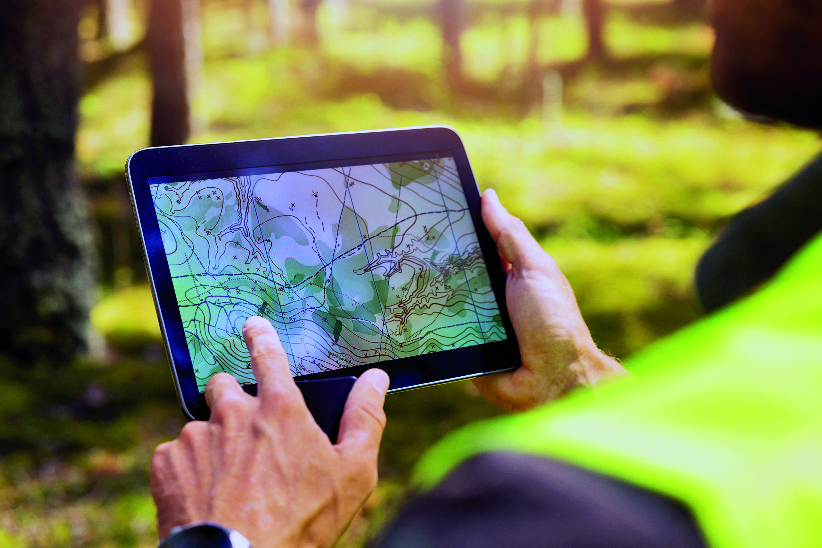 Das Bild zeigt Hände, die ein Tablet halten, auf dessen Bildschirm eine Karte mit Höhenlinien und weiteren Markierungen zu sehen ist. Der verschwommene Bildhintergrund zeigt, dass die Person, die das Tablet hält, in einem Wald steht.