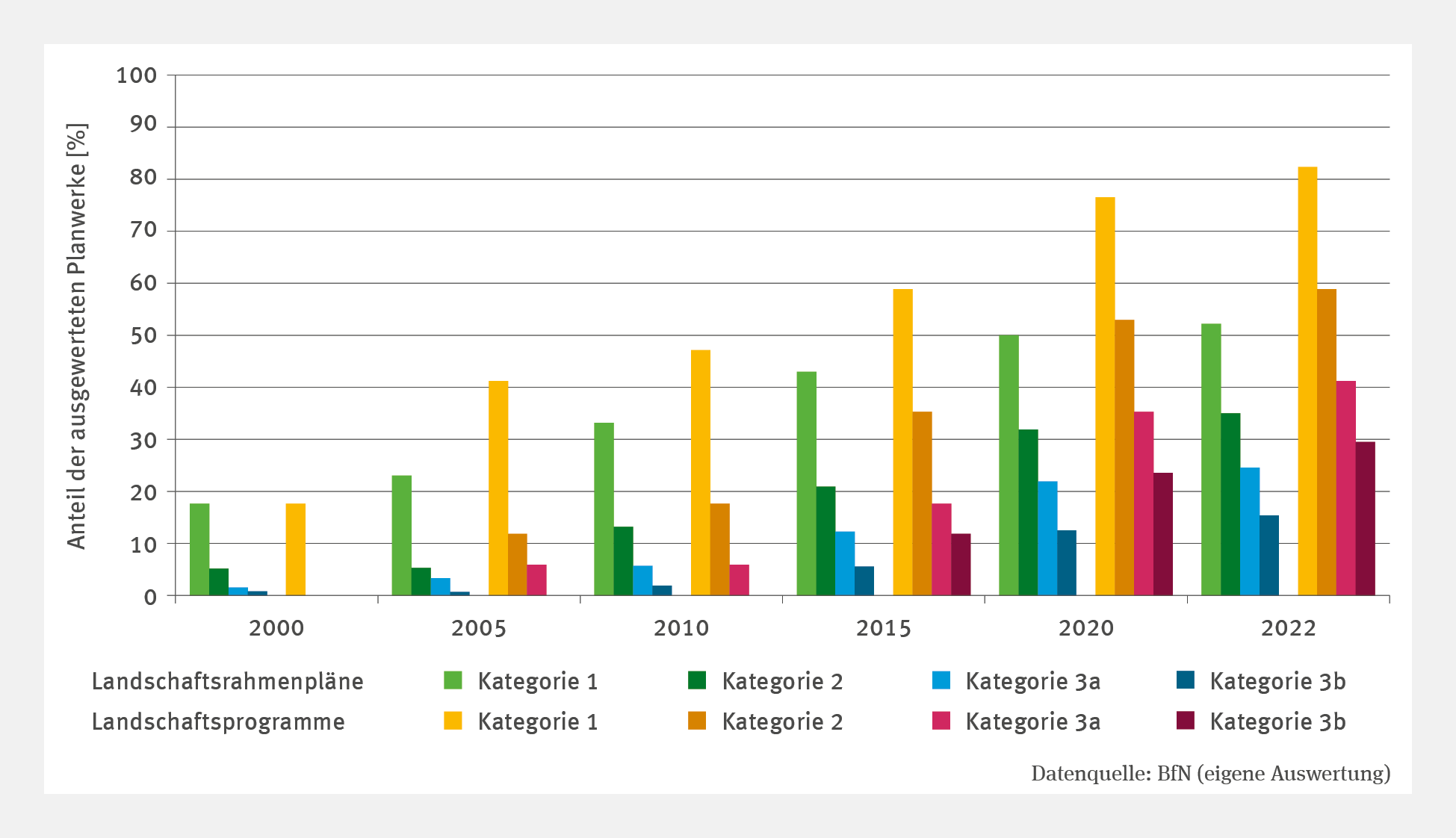 Die Abbildung BD-R-1 "Berücksichtigung des Klimawandels in Landschaftsprogrammen und -rahmenplänen" zeigt in gruppierten Säulen den Anteil der Planwerke, die den Klimawandel berücksichtigen, für die Jahre 2000 bis 2022. Dargestellt sind die Kategorien 1, 2, 3a und 3b. In allen Kategorien und bei beiden Planwerktypen ist ein kontinuierlicher Anstieg im Zeitverlauf erkennbar. Eine Trendanalyse wurde nicht durchgeführt. BD-R-1: Berücksichtigung des Klimawandels in Landschaftsprogrammen und -rahmenplänen