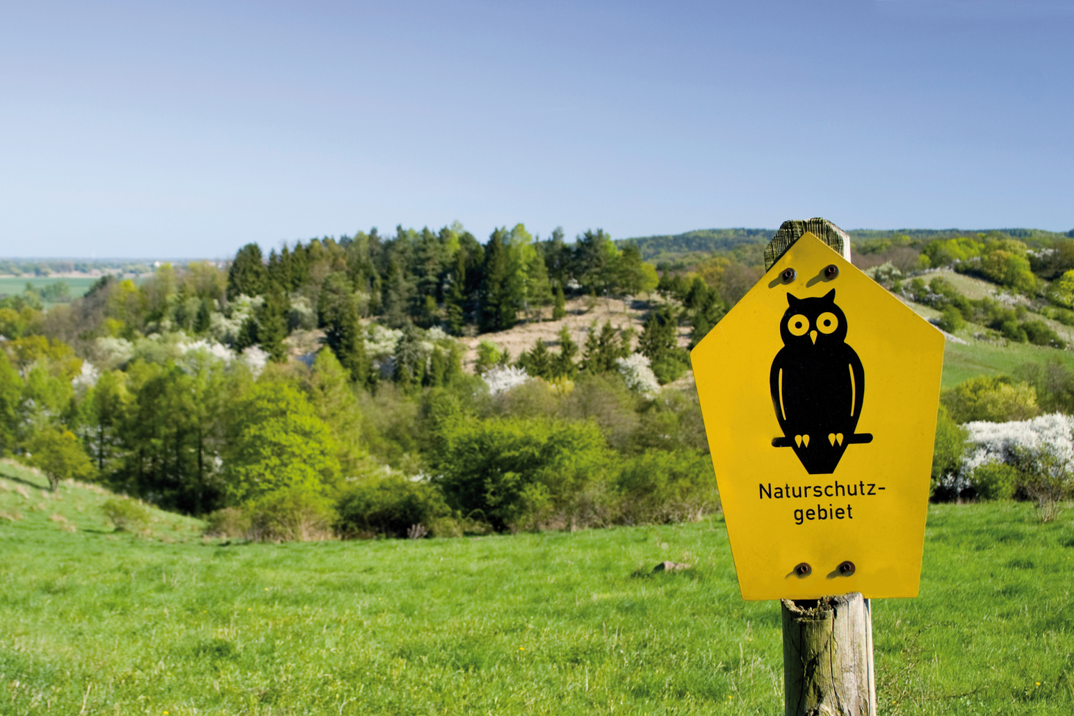 Das Bild zeigt das in den ostdeutschen Ländern übliche Schild zur Ausweisung eines Naturschutzgebiets. Es zeigt eine schwarze Eule auf gelbem Grund. Das Schild steht an einer Wiese, hinter der sich ein in Teilen bewaldeter Hühel erhebt.