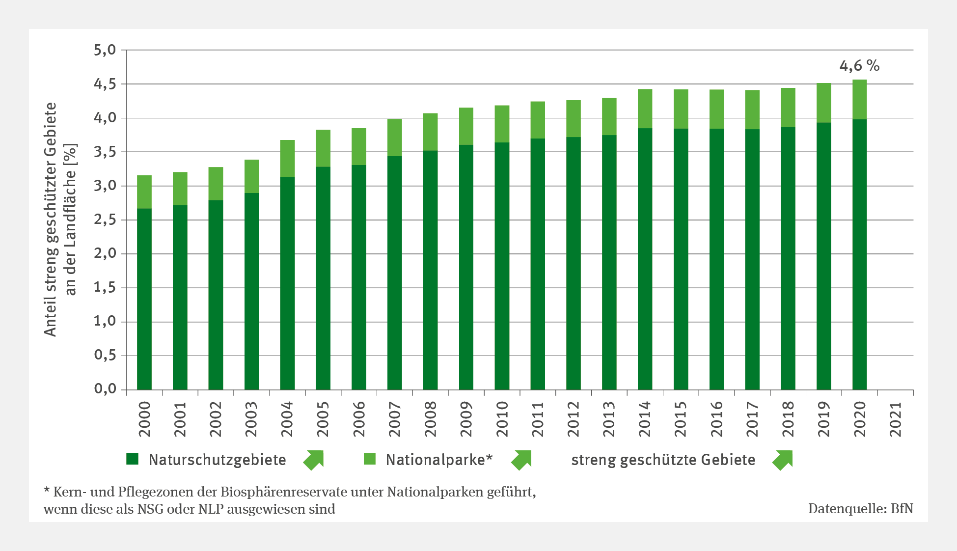 In Naturschutzgebieten und Nationalparken gelten strenge Schutzregelungen, um die Erhaltung und Entwicklung seltener und gefährdeter Arten und Biotope sicherzustellen. Bei Nationalparken spielt zudem die Großräumigkeit eine besondere Rolle. Im überwiegenden Teil eines Nationalparkgebiets soll ein möglichst ungestörter Ablauf natürlicher Vorgänge möglich sein. Der Indikator bilanziert die Gesamtfläche dieser geschützten Gebiete in Deutschland. Dafür wird der prozentuale Anteil der Flächen der Naturschutzgebiete und der Nationalparke an der Landfläche Deutschlands ermittelt. Natura-2000-Gebiete sowie Kern- und Pflegezonen der Biosphärenreservate sind hierin eingeschlossen, falls sie als Naturschutzgebiete oder Nationalparke ausgewiesen wurden. Die Fläche dieser geschützten Gebiete hat von 1.129.225 ha im Jahr 2000 auf 1.632.691 ha im Jahr 2020 zugenommen. Auf die Landfläche Deutschlands bezogen bedeutet dies eine Steigerung von 3,2 % im Jahr 2000 auf 4,6 % der Fläche im Jahr 2020.