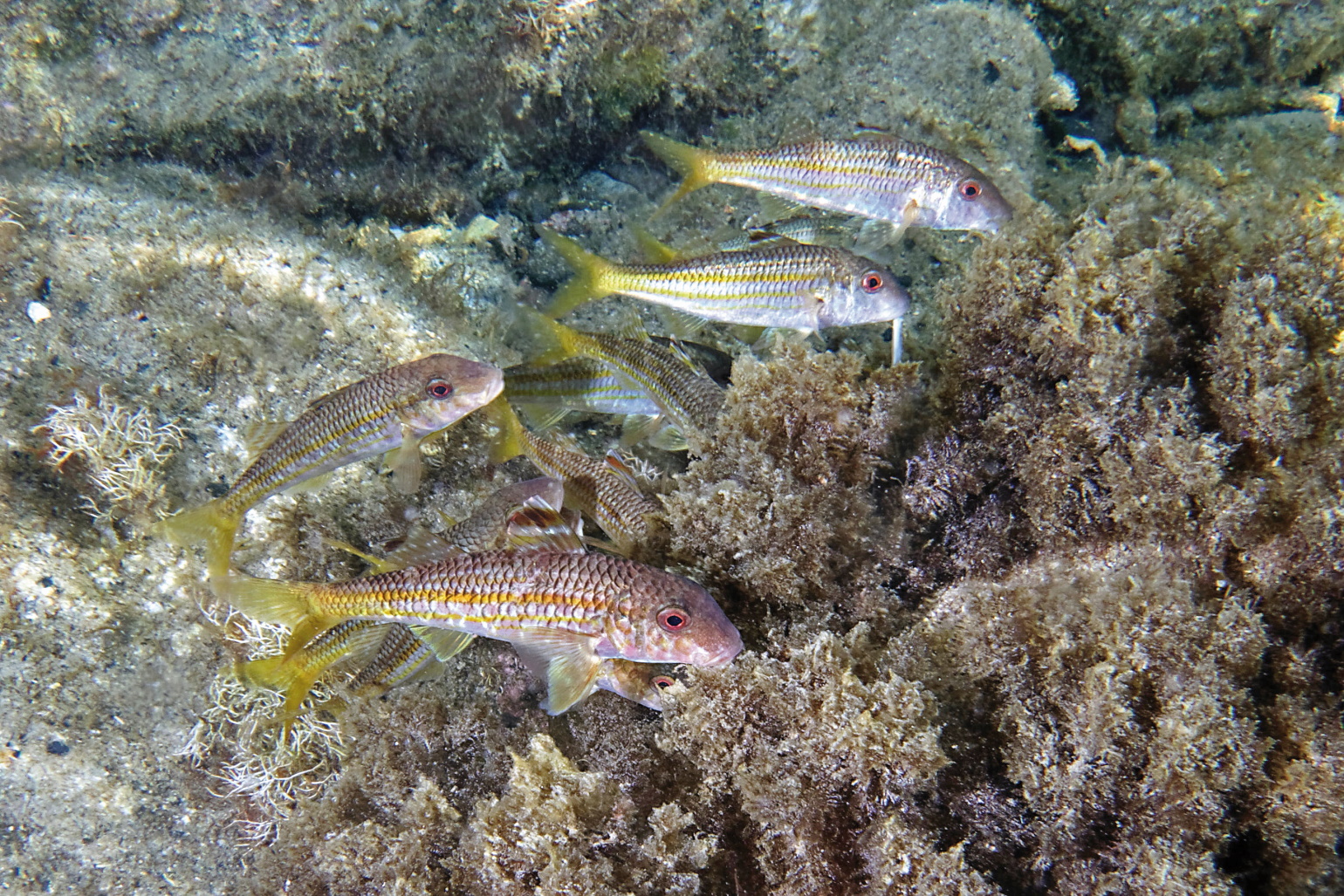 Das Bild zeigt mehrere Streifenbarben, die am Grund des Meeres schwimmen. Unter und hinter den Fischen sind Felsen und Wasserpflanzen zu erkennen.