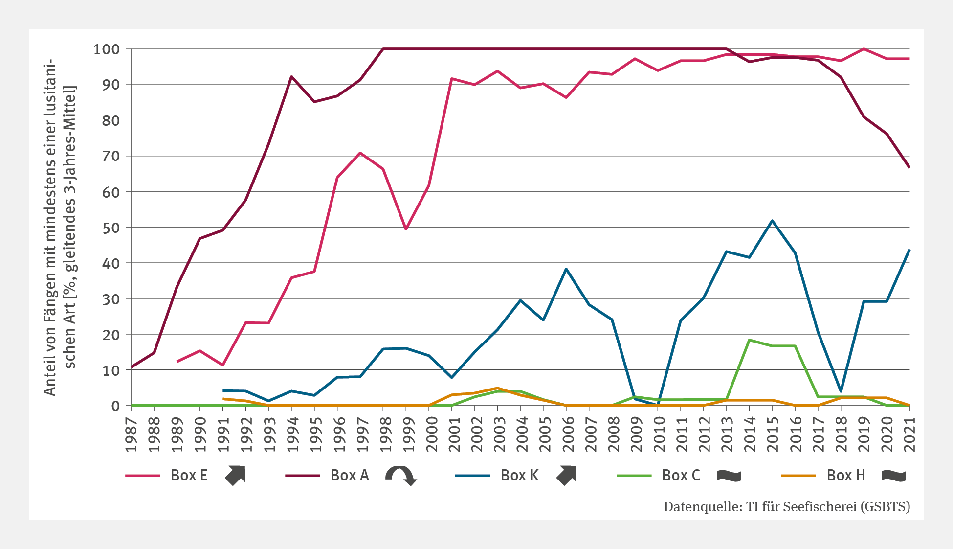 Die Abbildung FI-I-1 "Verbreitung warmadaptierter mariner Arten" zeigt den prozentualen Anteil von Fängen mit mindestens einer lusitanischen Fischart in einer Zeitreihe von 1987 bis 2021. Das gleitende 3-Jahres-Mittel ist für verschiedene Boxen dargestellt. Boxen E und K zeigen einen signifikant ansteigenden Trend, besonders seit 2007 in Box E (über 90 %). In Box A wurde 1998 ein Höchstwert von 100 % erreicht, fiel aber ab 2014 auf rund 67 % 2021, was eine deutliche Trendumkehr zeigt. FI-I-1: Verbreitung warmadaptierter mariner Arten