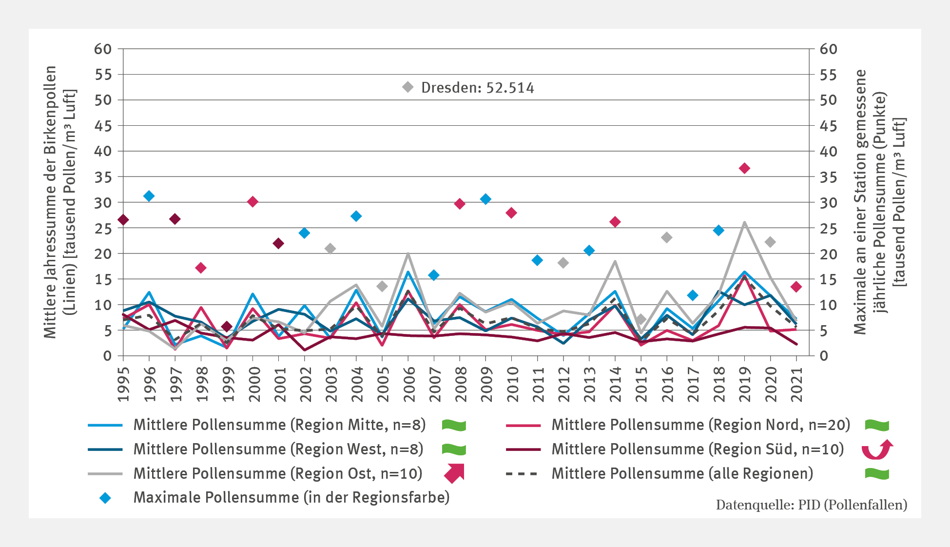 Die Grafik „Belastung mit Birkenpollen“ zeigt die mittlere Jahressumme in Tausend Pollen pro Quadratmeter Luft von 1995 bis 2021 für die Regionen Mitte, Nord, Ost, Süd, West und den Durchschnitt. Die Werte liegen zwischen zwei- und zwanzigtausend. In der Region Ost stiegen sie 2006, 2014 und 2019 über zwanzigtausend. Signifikant steigende Trends bestehen in Ost und Süd. Höchstwert: Dresden im Jahr 2006 mit 52.514 Pollen pro Quadratmeter Luft. GE-I-3: Belastung mit Birkenpollen