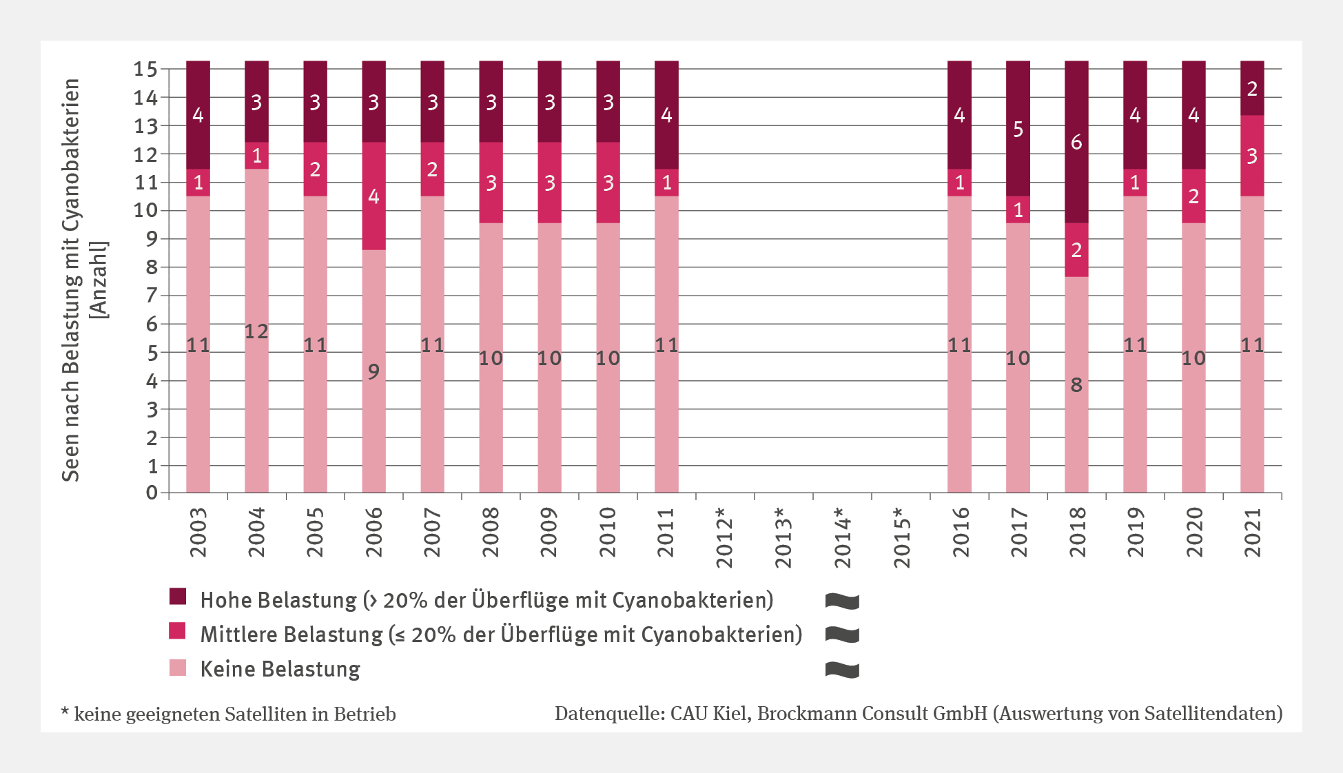 Für die Jahre 2003 bis 2011 sowie ab 2016 standen geeignete Satelliten zur Verfügung. In den Jahren dazwischen waren hingegen keine Satelliten in Betrieb, die über die erforderlichen sensorischen Eigenschaften verfügten. Dem Indikator liegen die Daten zu vier Seen im Bereich der Alpen und des Alpenvorlands, drei Seen in der zentralen Mittelgebirgsregion und zu acht Seen im Norddeutschen Tiefland zugrunde. Der Bodensee wurde doppelt erfasst (Untersee, Obersee). Es wird an einer Ausweitung dieser Seenauswahl gearbeitet. Die Überflüge in den relevanten Monaten zwischen Juli und September wurden auf das Vorkommen von Cyanobakterien hin ausgewertet. Als Bedingung für ein solches Vorkommen wurde festgelegt, dass in mindestens 30 % der korrekt erfassten Pixel (Rasterzellen) positive Cyanomarker (Phycocyanin) auftreten. Wenn bei höchstens 20 % aller validen Überflüge Cyanobakterienvorkommen erfasst werden, wird von einer mittleren, bei über 20 % aller validen Überflüge von einer hohen Belastung im jeweiligen Jahr ausgegangen.