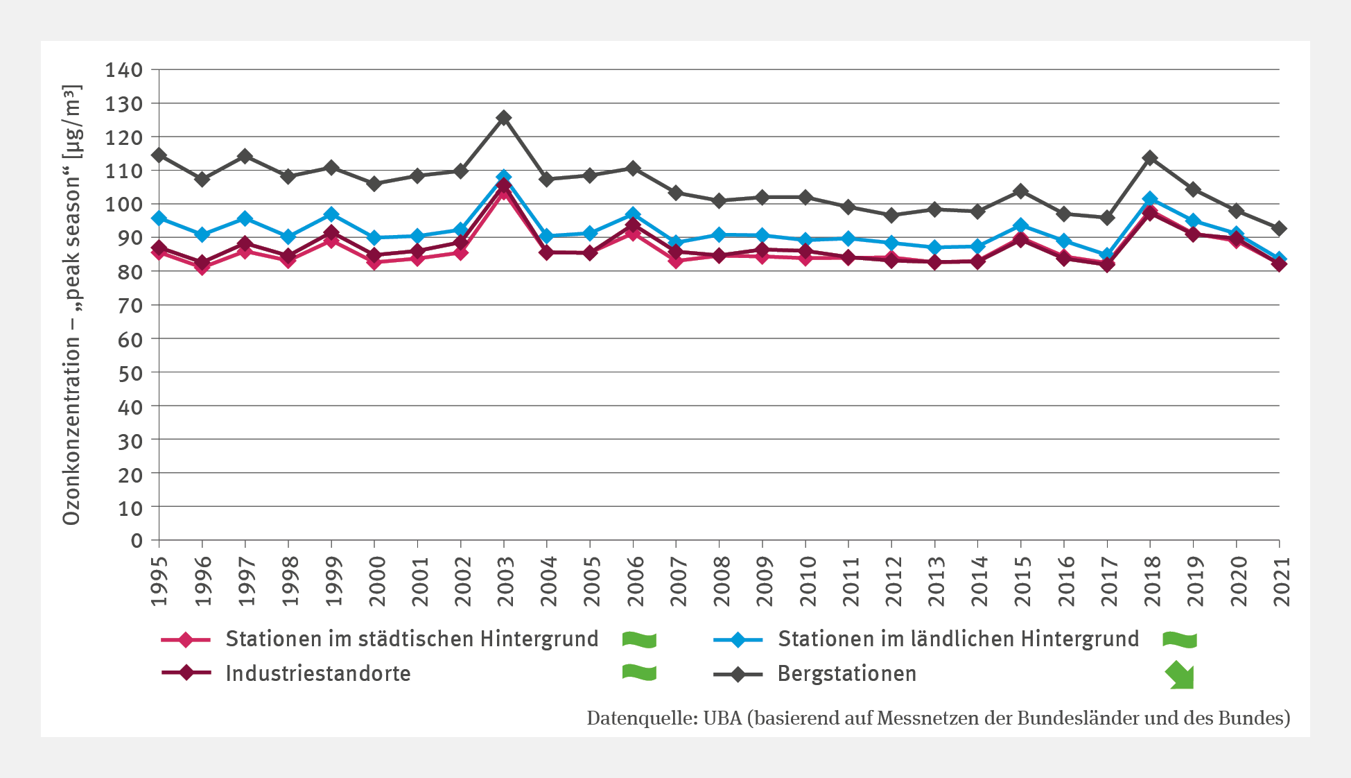 Seit 1995 sind die Konzentrationen während der „ozone peak season“ nahezu unverändert, an den Bergstationen sind sie sogar zurückgegangen. Grund ist, dass die Emissionen der Ozonvorläuferstoffe rückläufig waren. Die Zeitreihe zeigt aber zwischenjährliche Schwankungen, die sich vor allem mit besonderen sommerlichen Witterungsbedingungen erklären lassen. So konnten sich im „Ozonsommer“ 2003 während einer langanhaltenden sommerlichen Schönwetterperiode mit überdurchschnittlich hohen Temperaturen und langer Sonnenscheindauer hohe Ozonkonzentrationen aufbauen. Ganz anders verhielt es sich im Sommer 2018 mit erneuten Temperaturrekordwerten vor allem im Juli und August: Die mittleren Konzentrationsbereiche waren zwar erhöht, aber hohe Spitzenkonzentrationen blieben nahezu aus. Es wird deutlich, dass auch bei rückläufigen Konzentrationen der Ozonvorläufersubstanzen extreme Witterung nach wie vor zu deutlich erhöhten Ozonkonzentrationen führen kann. Der Klimawandel treibt mit höheren Temperaturen und intensiverer Sonneneinstrahlung die Bildung von bodennahem Ozon an und führt dazu, dass es immer wieder zu gesundheitlichen Belastungen durch zu hohe Ozonkonzentrationen kommen kann.