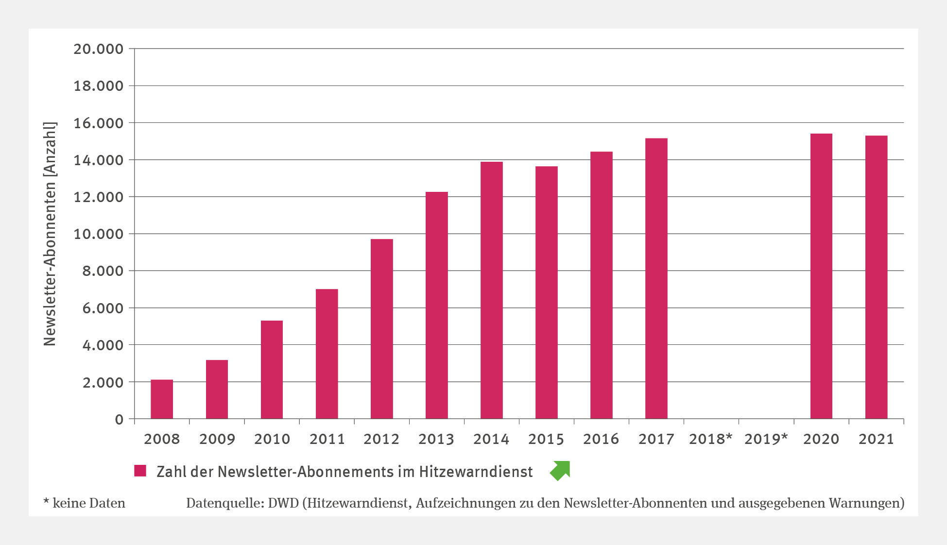 Der „Newsletter Hitzewarnungen“ des DWD informiert, wenn für den aktuellen oder den nächsten Tag mit einer „starken“ oder „extremen Wärmebelastung“ gerechnet werden muss. In den zurückliegenden Jahren hat sich die Zahl der Newsletter-Abonnenten (stationäre Einrichtungen und Privatpersonen) kontinuierlich erhöht. Die Entwicklung ist aber zuletzt ins Stocken geraten, da vor allem die Nutzung von Warn-Apps zugenommen hat.