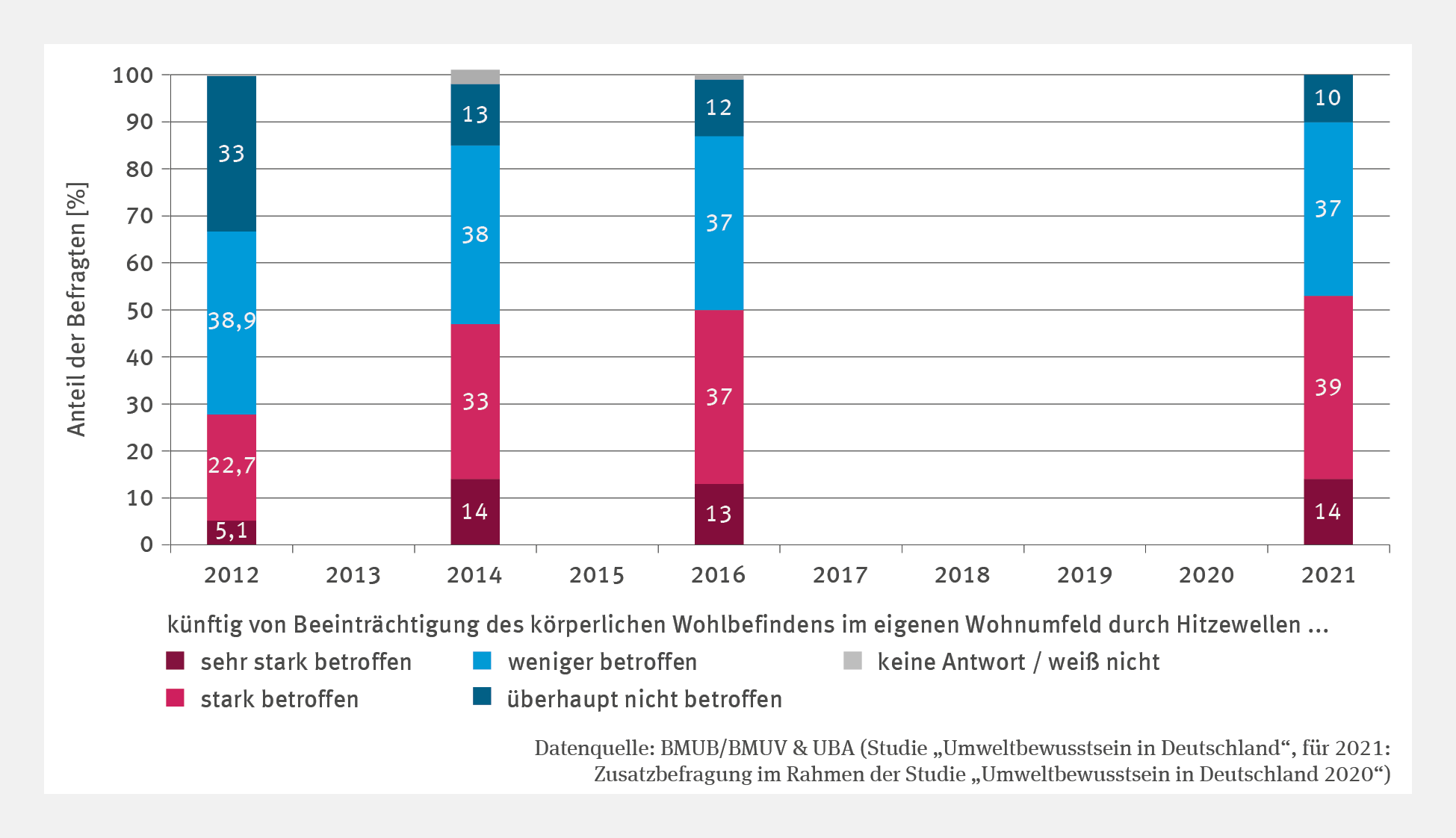 Eine intensivere Öffentlichkeitsarbeit zu Hitzefolgen und die verstärkte Risikokommunikation sowohl von behördlicher als auch ärztlicher Seite sind sicher Gründe, warum das Bewusstsein der Bevölkerung für gesundheitliche Beeinträchtigungen durch Hitzeperioden in den letzten Jahren angestiegen ist. Dies zeigen die Ergebnisse der repräsentativen Bevölkerungsumfrage „Umweltbewusstsein in Deutschland“, die regelmäßig im Auftrag des UBA und des Bundesumweltministeriums durchgeführt wird49. Der Anteil der befragten Personen, die subjektiv für sich in Zukunft erwarten, dass Hitzewellen ihr körperliches Wohlbefinden oder ihre Gesundheit sehr stark oder stark betreffen werden, hat seit der Ersterhebung im Jahr 2012 zugenommen. Der Anstieg war zuletzt zwar weniger deutlich als in den Anfangsjahren der Erhebung, aber 2021 gingen bereits 53 % der Befragten von einer starken bis sehr starken Betroffenheit aus. Nur noch 10 % sahen sich 2021 überhaupt nicht betroffen, bei der Erstbefragung galt das noch für 33 % der Befragten. Im Jahr 2021 wurden die Daten erstmalig im Rahmen einer künftig nur noch 4-jährlichen Sondererhebung zur Umweltbewusstseinsstudie erfasst. Ein weiterer Grund für die stärkere Wahrnehmung der hitzebedingten Risiken ist aber sicher auch, dass gerade in den letzten zehn Jahren wiederholt Rekordtemperaturen und Hitzewellen aufgetreten sind. Die Folgen des Klimawandels sind damit auch im eigenen Erleben angekommen.