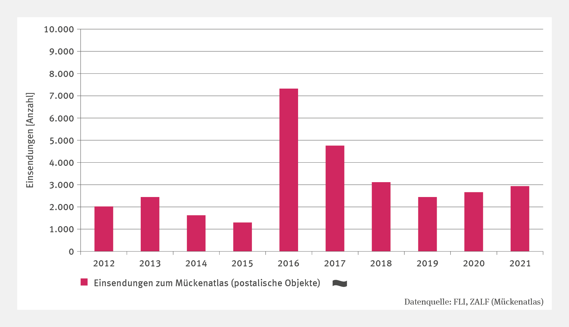 Die Zeitreihe zu den Mücken-Einsendungen macht deutlich, dass die Bevölkerung für die Thematik und Problematik der Einschleppung und Ausbreitung von nichtheimischen Mücken bereits sensibilisiert ist. So ist der deutliche Sprung bei den Einsendungen im Jahr 2016 nach Einschätzung von Fachleuten im ZALF und FLI wesentlich darauf zurückzuführen, dass die Zika-Epidemie in Südamerika in den Jahren 2015 und 2016 große Aufmerksamkeit auch in Europa erlangt hat. Vor allem im zeitlichen Zusammenhang mit den in 2016 in Brasilien abgehaltenen Olympischen Sommerspielen gab es intensive Presseaktivitäten zur Problematik, die offensichtlich dazu geführt haben, dass die Bevölkerung ein sehr offenes Auge für das Vorkommen potenziell gefährlicher Mücken auch in Deutschland hatte. Dies äußerte sich in einer außerordentlich hohen Anzahl von Einsendungen.