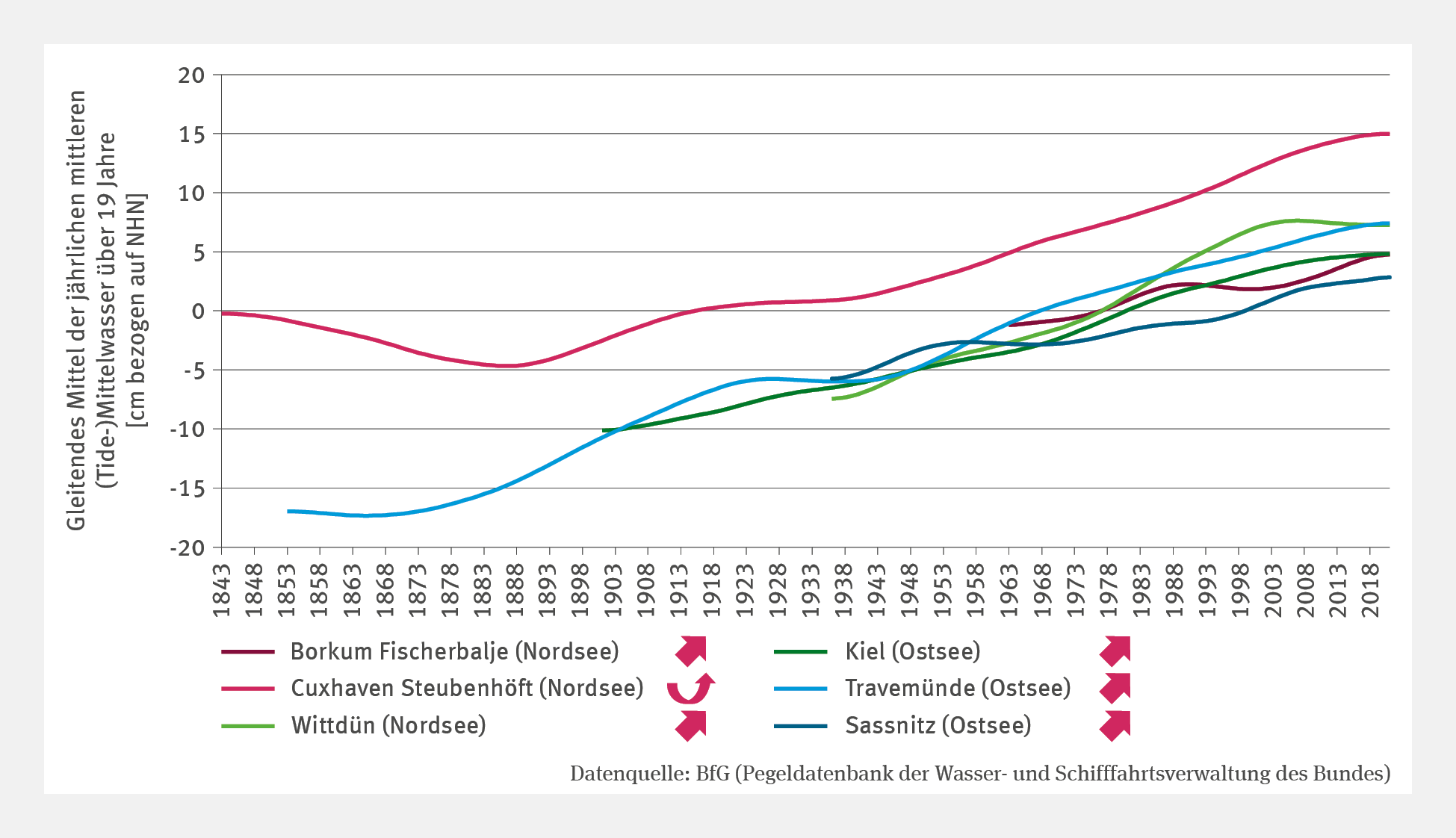 An allen untersuchten Pegeln sind die Mittleren (Tidemittel-) Wasserstände über die letzten 60 bis 180 Jahre statistisch signifikant steigend. Analog zur Entwicklung des globalen Meeresspiegelanstiegs79 ergibt die Trendanalyse am Pegel Cuxhaven Steubenhöft an der Nordsee einen säkularen (statistisch signifikanten quadratischen) Trend, der etwa seit Ende des 19. Jahrhunderts beginnt und von einer jeweils mehrere Dekaden umfassenden Variabilität überlagert ist. Von Beginn der Aufzeichnungen bis etwa zum Ende der 1880er-Jahre ist der Meeresspiegel an diesem Pegel zunächst gesunken, bevor ein kontinuierlicher Anstieg beobachtet wurde. Am Pegel Wittdün waren die Wasserstände zuletzt leicht rückläufig. Dies geht möglicherweise auf morphologische Änderungen im Umfeld des Pegels zurück.