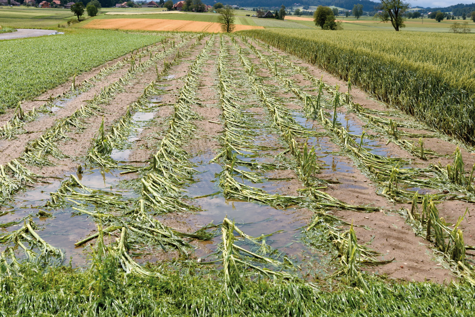 Schäden in landwirtschaftlichen Kulturen können u. a. durch Hagel, Sturm oder Starkregen entstehen.