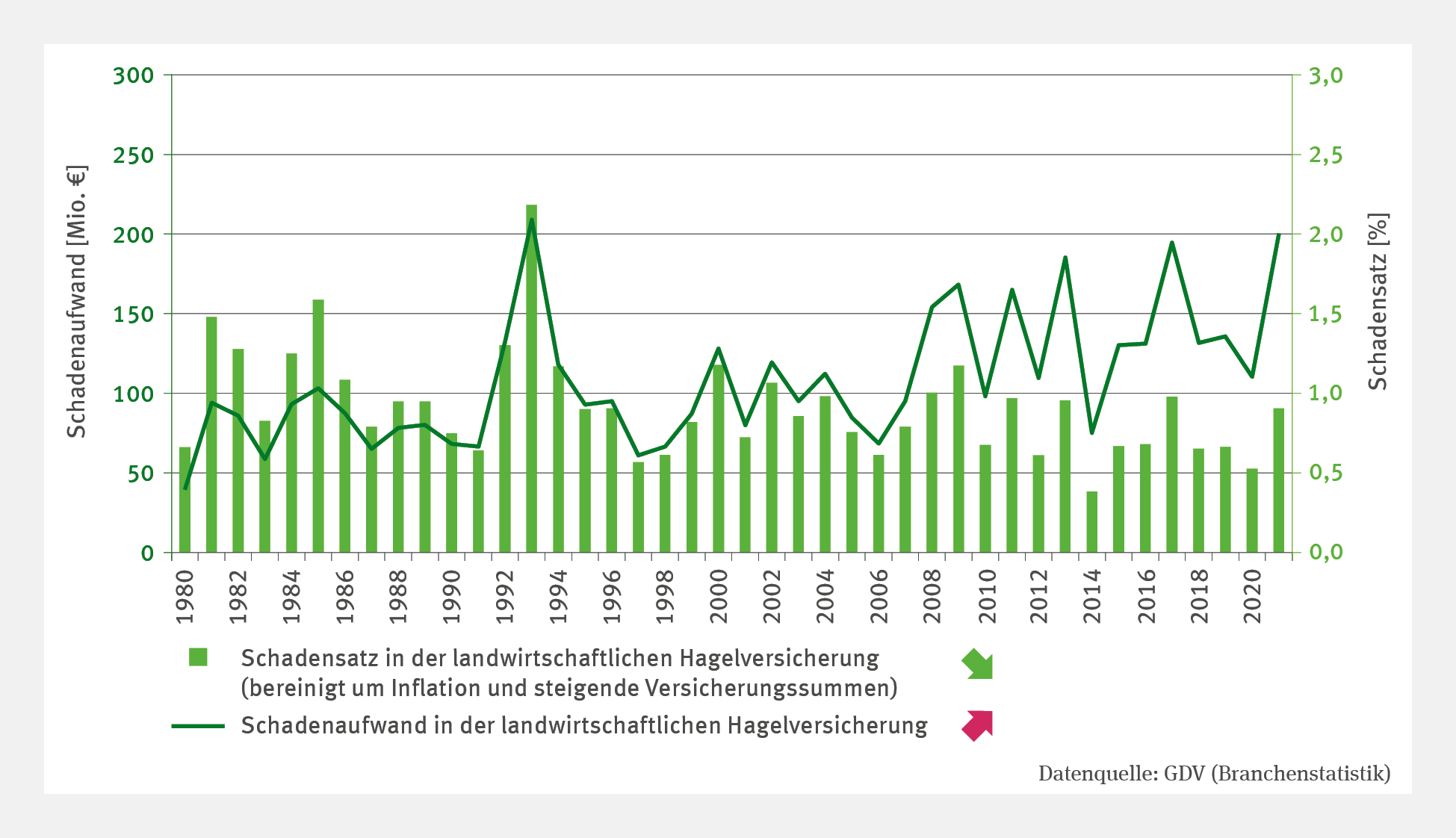 Extremwetterereignisse wie Dürre, Hagel, Sturm, Starkregen, Überschwemmung, Frost und Auswinterung können Ertragseinbußen in der Landwirtschaft zur Folge haben. Versichert sind in der Regel aber nur Hagelschäden. Der zunehmende Schadenaufwand ist wesentlich durch steigende Versicherungssummen verursacht. Der Schadensatz erlaubt direktere Rückschlüsse auf Hagelereignisse. Er zeigt einen fallenden Trend.