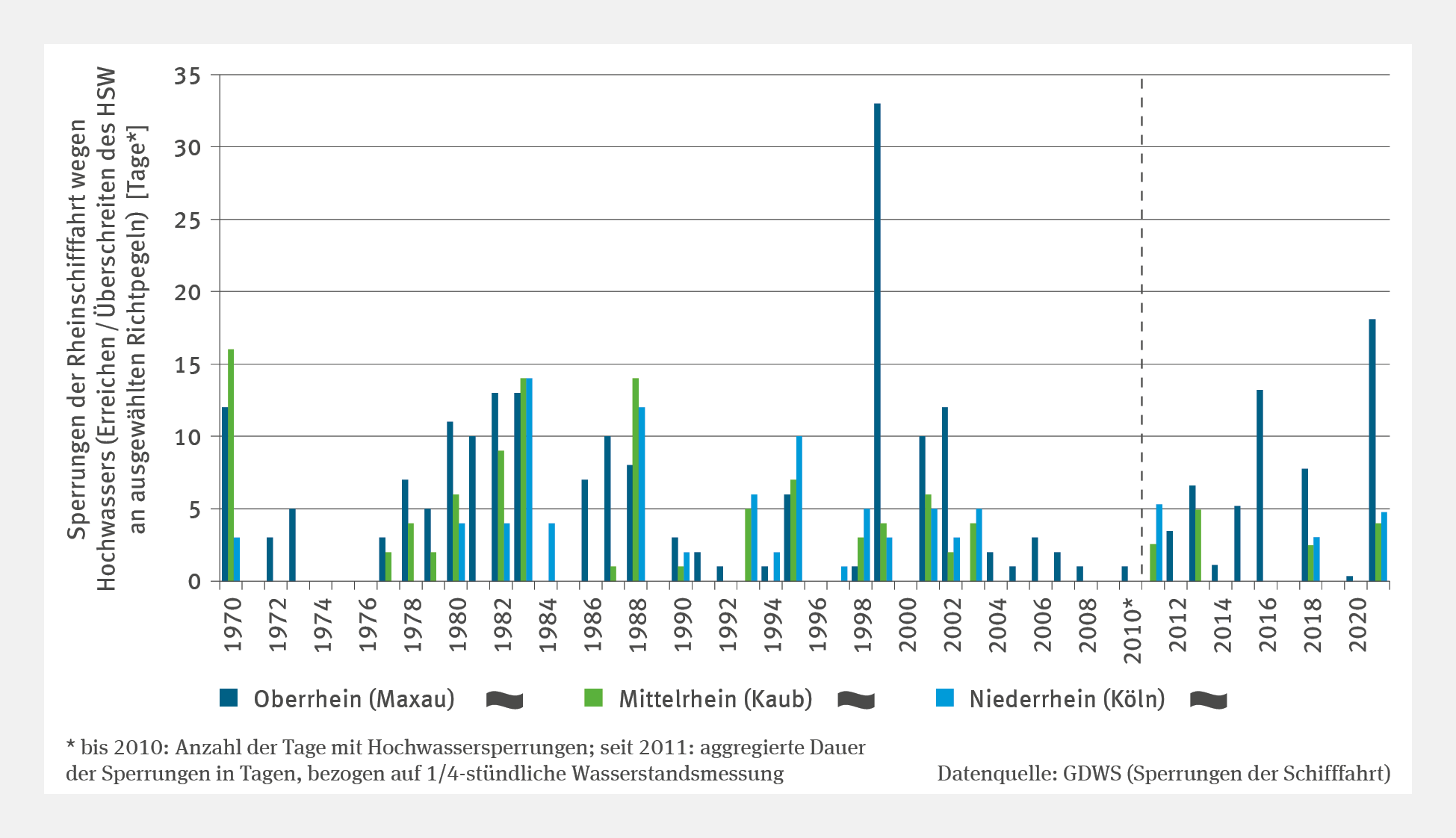 Die Regeln für den Schiffsverkehr auf dem Rhein gibt die Rheinschifffahrtspolizeiverordnung vor. Danach müssen die Schiffe unter anderem die Geschwindigkeit verringern und mit einer Sprechfunkanlage ausgerüstet sein, wenn der Wasserstand die Hochwassermarke I überschreitet. Wird der Höchste Schifffahrtswasserstand (HSW) überschritten, sind die betroffenen Abschnitte für die Schifffahrt zu sperren. Besonders prägnant waren die Sperrungen im Spätwinter und Frühjahr des Jahres 1999, als der Oberrhein infolge zweier Hochwasser über mehrere Wochen nicht für die Schifffahrt freigegeben war. 2021 gab es am Oberrhein zunächst Ende Januar sowie später im Juli infolge ergiebiger Regenfälle längere Sperrungen. An Mittel- und Niederrhein kam es seit dem Jahr 2000 nur zu kürzeren Sperrungen, die zumeist nach weniger als einer Woche wieder aufgehoben wurden. Signifikante Trends zu mehr Hochwassersperrungen auf dem Rhein sind bislang nicht zu verzeichnen.