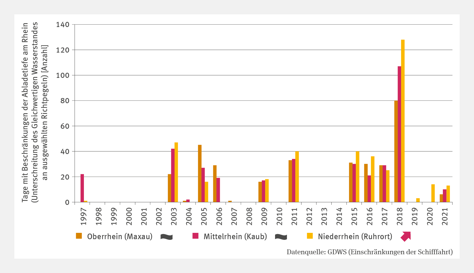 Unterschreiten die Wasserstände einen flussabschnittsbezogenen Schwellenwert, bei dem die Solltiefe der Fahrrinne noch sicher gegeben ist (am Rhein definiert der sogenannte gleichwertige Wasserstand diese Schwelle), ist die Binnenschifffahrt in aller Regel noch möglich, jedoch in Abhängigkeit vom Ausmaß der Unterschreitung sowie von der Größe und Bauweise der Binnenschiffe unterschiedlich stark eingeschränkt. Am Rhein treten solche Niedrigwasserphasen in der Regel im Spätsommer von August bis Oktober auf. In den letzten Jahren dauern die Niedrigwasserphasen aber auch bis in den November oder Dezember. So war es in den Jahren 2011 und 2015 sowie zuletzt besonders ausgeprägt in 2018. Für den Niederrhein zeigt die Zeitreihe seit 1997 eine signifikante Zunahme der Niedrigwassereinschränkungen.