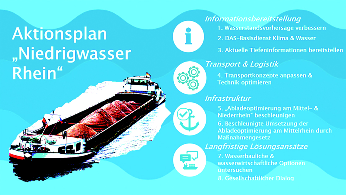 Ein Jahr nach den massiven niedrigwasserbedingten Einschränkungen für die Rheinschifffahrt und den damit verbundenen ökonomischen Folgen legte das damalige Bundesministerium für Verkehr und digitale Infrastruktur (BMVI) im Sommer 2019 den Aktionsplan „Niedrigwasser Rhein“ vor. Gemeinsam mit Vertreter*innen großer Industrieunternehmen im Rheineinzugsgebiet und des Binnenschifffahrtsgewerbes wurden acht Maßnahmen entwickelt, um die Bedingungen für den Gütertransport auf dem Rhein zuverlässiger und zukunftssicher zu gestalten.
