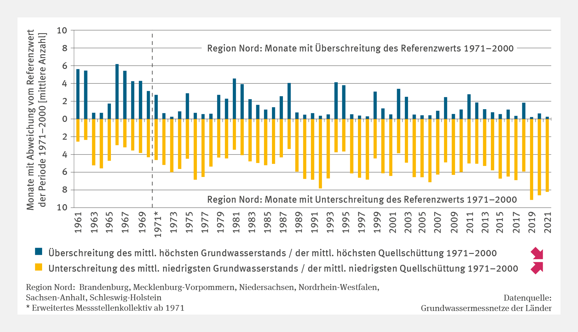 Aufgrund der unterschiedlichen naturräumlichen und klimatischen Voraussetzungen innerhalb Deutschlands wird der Indikator differenziert für den nördlichen und südlichen Teil Deutschlands abgebildet. Dargestellt ist jeweils die über alle Messstellen gemittelte Anzahl von Monaten, in denen die Monatsmittel der Grundwasserstände oder Quellschüttungen niedriger waren als die für die jeweiligen Messstellen über die Jahre 1971 bis 2000 gemittelten niedrigsten Grundwasserstände oder Quellschüttungen. Analog wurde beim Vergleich der Monatsmittel der Grundwasserstände oder Quellschüttungen mit den langjährigen höchsten Grundwasserständen oder Quellschüttungen verfahren.