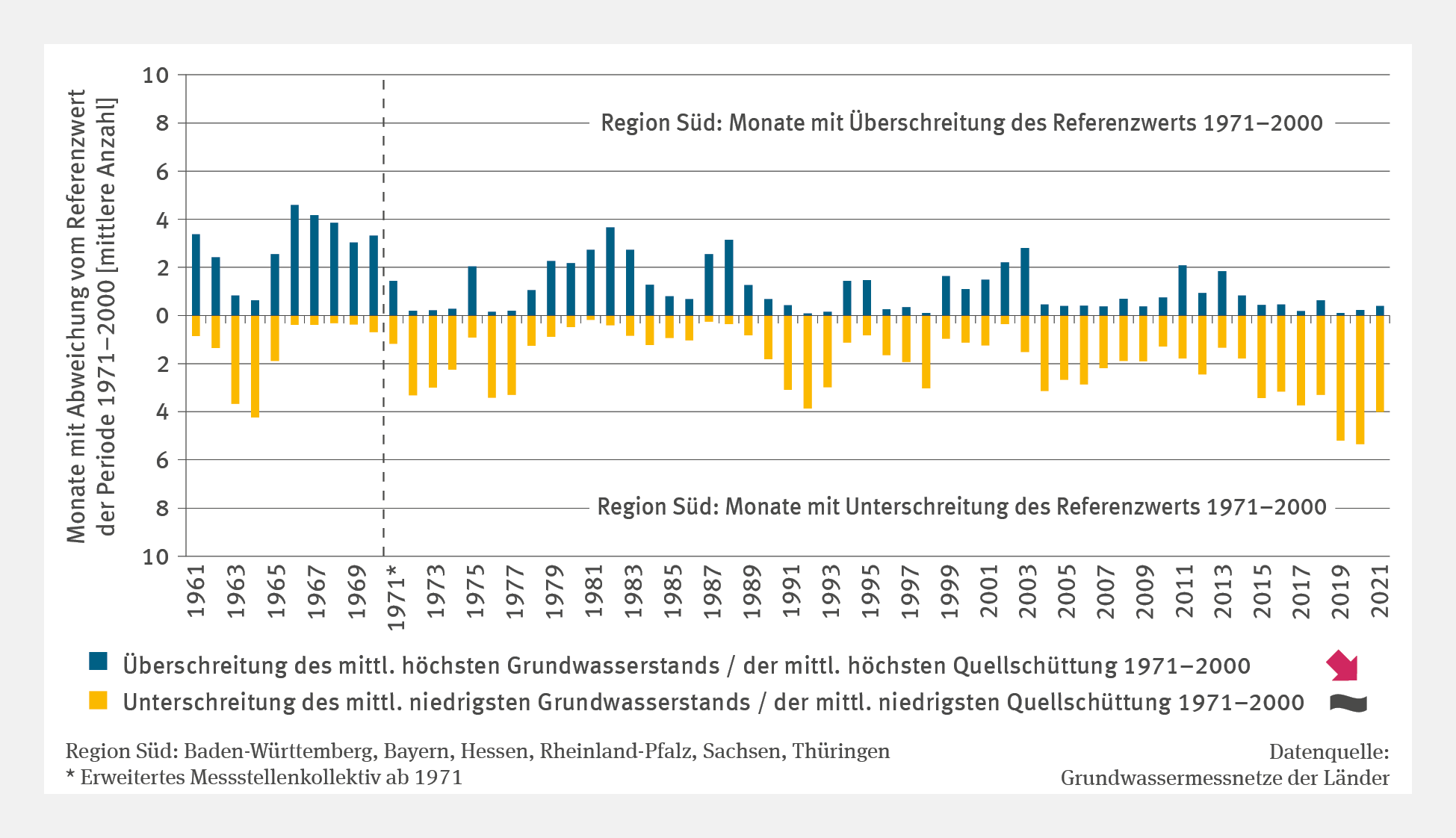Die Trends einer sinkenden Anzahl von Monaten mit Überschreitung der langjährigen höchsten Grundwasserstände oder Quellschüttungen sowie einer steigenden Anzahl von Monaten mit Unterschreitung der langjährigen niedrigsten Grundwasserstände oder Quellschüttungen sind im Norden deutlicher ausgeprägt als im Süden und statistisch signifikant. Im Süden sind nur die rückläufigen Überschreitungen signifikant. In beiden Regionen kam es aber als Folge der extrem trockenen Jahre 2018 bis 2020 ab 2019 zu Rekordniedrigständen. Es gibt mehrere Messstellen, an denen ab 2019 (fast) ganzjährig die Monatsmittel der Grundwasserstände oder Quellschüttungen unter den langjährigen niedrigsten Grundwasserständen oder Quellschüttungen lagen.