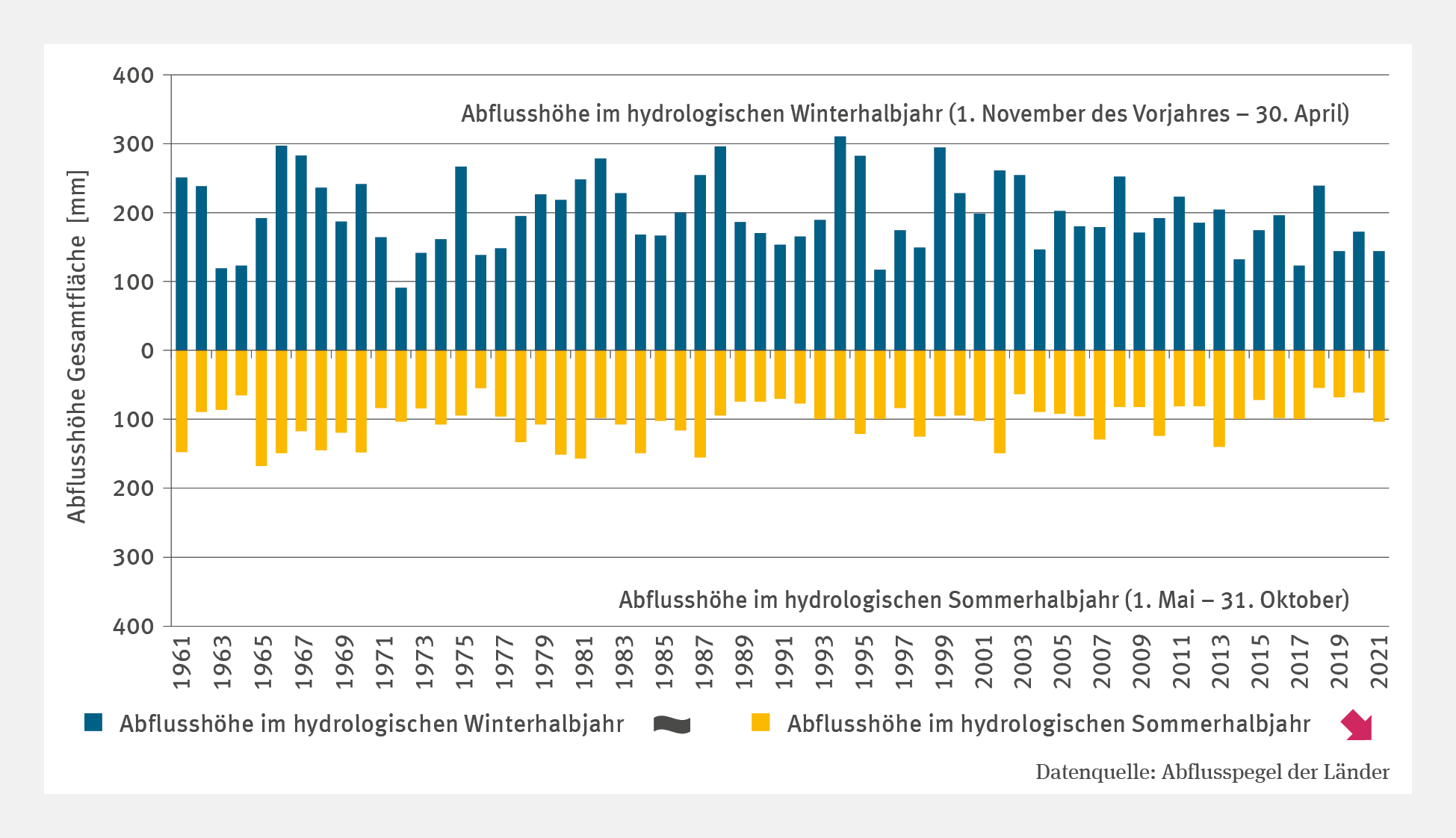 Über Deutschland gemittelt sind aufgrund der oben beschriebenen Wirkung von Niederschlag und Verdunstung die winterlichen Abflüsse generell deutlich höher als die Abflüsse im Sommerhalbjahr. Das Niedrigwasserjahr 1972 ist das einzige Jahr in der betrachteten Zeitreihe, in dem die sommerlichen Abflüsse die winterlichen geringfügig übertroffen haben. Seither war dies in keinem Jahr mehr der Fall. Allerdings zeigt das Verhältnis der mittleren Abflüsse im Sommer- und Winterhalbjahr bisher keine statistisch signifikante Veränderung.
