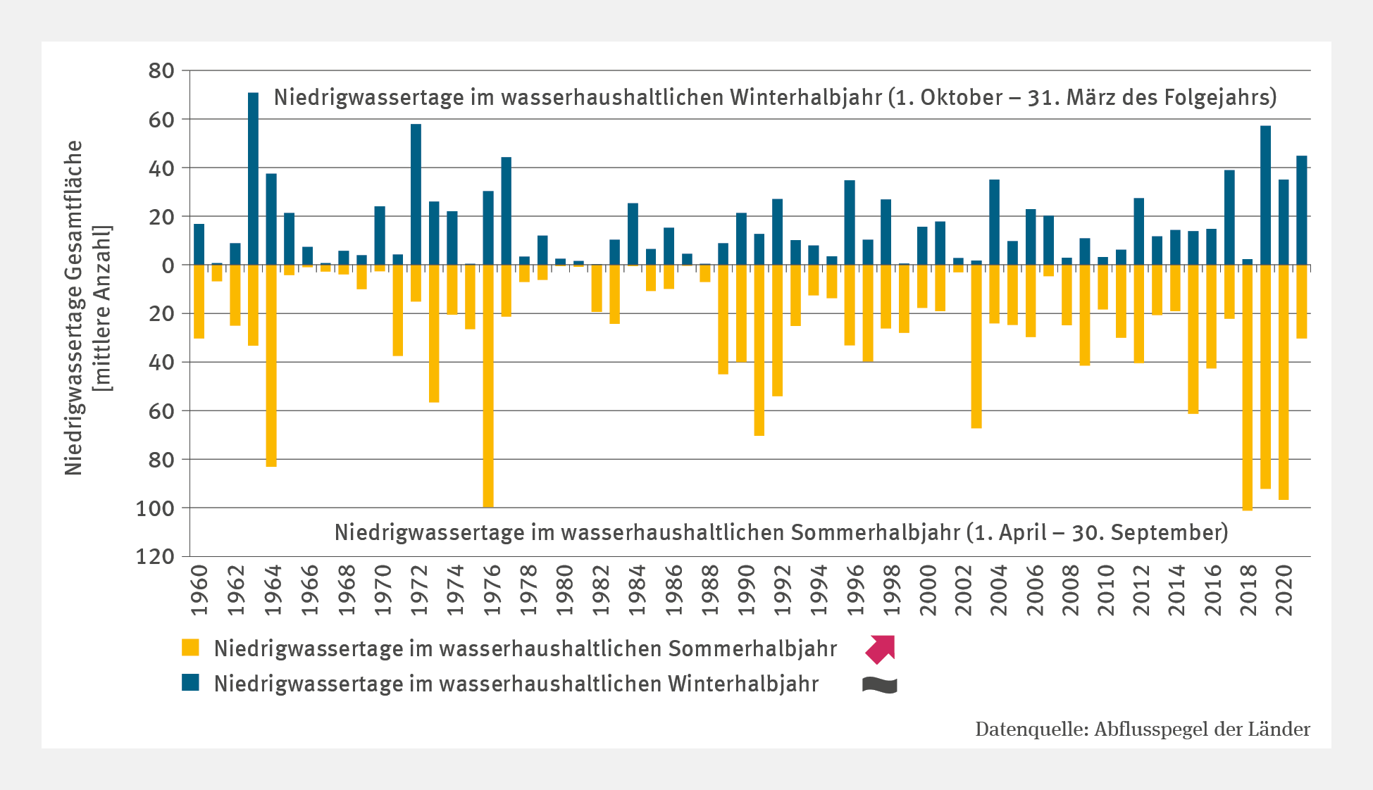 Für die dargestellte Zeitreihe wurden die Abflusswerte von 76 Pegeln an deutschen Flüssen daraufhin ausgewertet, an wie vielen Tagen im wasserhaushaltlichen Sommerhalbjahr (1. April bis 30. September) und Winterhalbjahr (1. Oktober bis 31. März des Folgejahres) Niedrigwasser aufgetreten ist. Ein Niedrigwassertag ist definiert als ein Tag, an dem der mittlere jährliche Tagesabfluss niedriger ist als der für den jeweiligen Pegel ermittelte mittlere Niedrigwasserabfluss (MNQ) der Zeitspanne 1961–1990. Der MNQ wird aus den jeweils niedrigsten Abflüssen der einzelnen Wasserhaushaltsjahre (NQ) berechnet. Mittelt man die Anzahl der Niedrigwassertage über alle betrachteten Pegel, wird deutlich, dass es immer wieder einzelne Jahre mit einer extremen Häufung von Niedrigwassertagen gegeben hat. Im Rückblick auf die letzten vier Jahrzehnte traten solche Häufungen vor allem in den Jahren 1991, 2003 und 2015 sowie zuletzt in den Jahren 2018 bis 2020 auf. Hiervon waren besonders stark die Flussgebiete Rhein, Elbe und Weser, etwas weniger ausgeprägt auch die Donau betroffen. In den Flussgebietseinheiten von Eider / Schlei, Schlei / Trave und Warnow / Peene wiesen die Wasserhaushaltsjahre 1996 und 2009 sowie die Jahre 2018 bis 2020 eine hohe Anzahl an Niedrigwassertagen auf. Niedrigwasserereignisse lassen sich in der Regel auf stabile Hochdruckwetterlagen zurückführen. Die Auswirkungen treten daher in der Regel auch sehr großräumig auf.