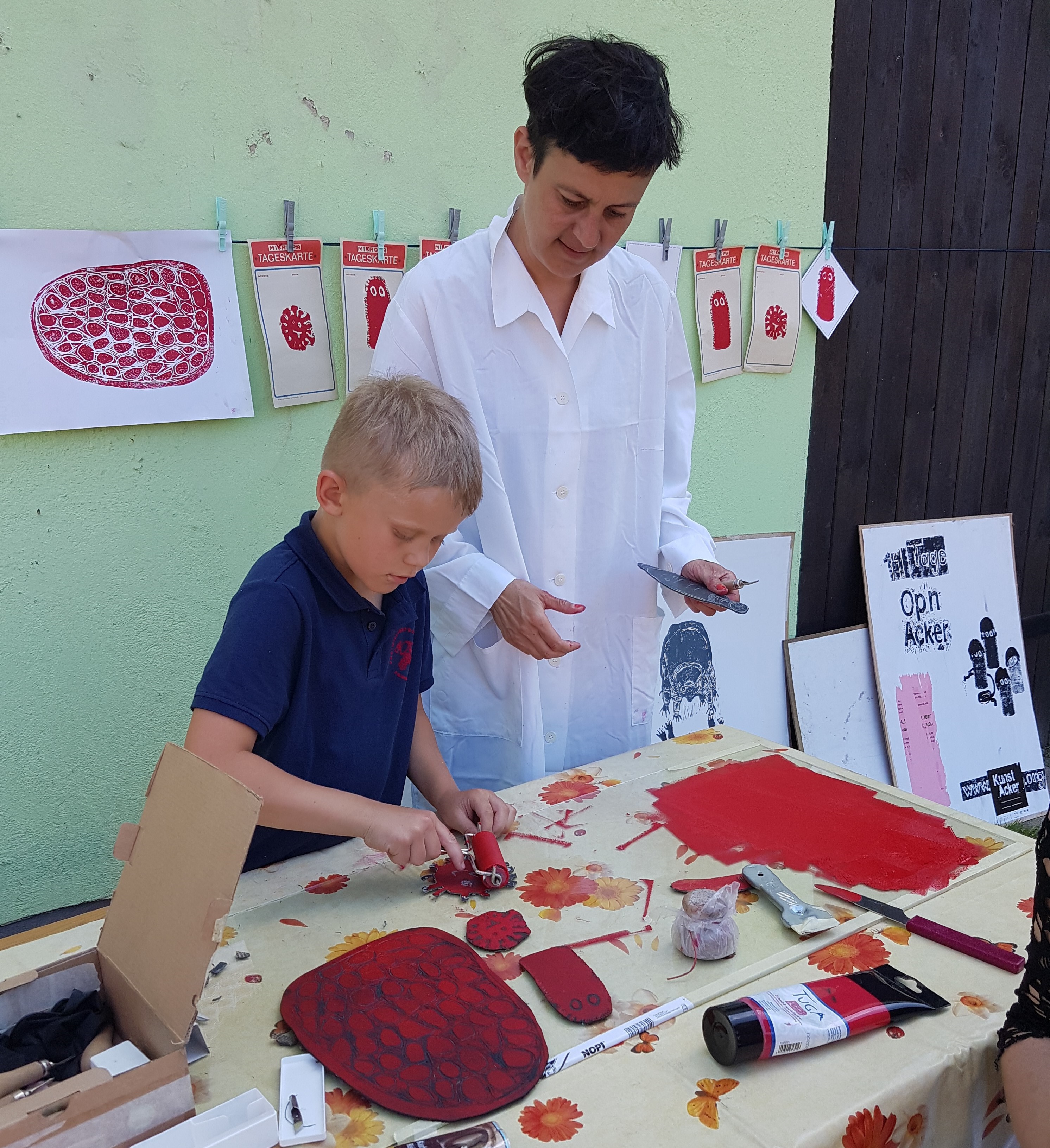 In einer Handvoll Erde können – abhängig von der Bodenqualität – mehr Organismen leben als es Menschen auf der Erde gibt. Der Workshop geht mit den Teilnehmenden auf mikrobiologische Entdeckungsreise: Eine Handvoll Boden kommt unter die Lupe, dann unters Mikroskop, als Projektion auf die Leinwand. Die rasterelektronischen Aufnahmen inspirieren zum Entwurf der Protagonisten von Mikropia. Ihre Gestalt wird auf Linoleumplatten geschnitten und geritzt, anschließend auf Poster-Papier gedruckt und vervielfältigt. Ebenso werden durch die kreative Verarbeitung von Fundstücken und Erdmaterialien Poster erzeugt, entstehen mit Fotos und natürlichen Druckstöcken Kollagen und Comics. Derart bekommen die ansonsten unsichtbaren Mikroben Gesicht wie Stimme und überbringen Botschaften aus einer faszinierenden Welt. Der Workshop richtet sich an Jung und Alt. Die entstandenen Arbeiten können nach Hause genommen werden.