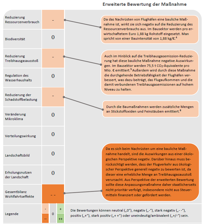 ( - - )Gesamtbilanz der Wohlfahrtseffekte Da es sich beim Nachrüsten um eine bauliche Maßnahme handelt, sind die Auswirkungen aus einer ökologischen Perspektive negativ. Darüber hinaus muss berücksichtigt werden, dass der Flugverkehr aus ökologischer Perspektive generell negativ zu bewerten ist, da dieser eine erhebliche Menge an Treibhausgasausstoß verursacht. Aus Perspektive der erweiterten Bewertung sollte diese Anpassungsmaßnahme daher staatlicherseits nicht prioritär verfolgt, insbesondere nicht aus Steuermitteln finanziert oder gefördert werden.