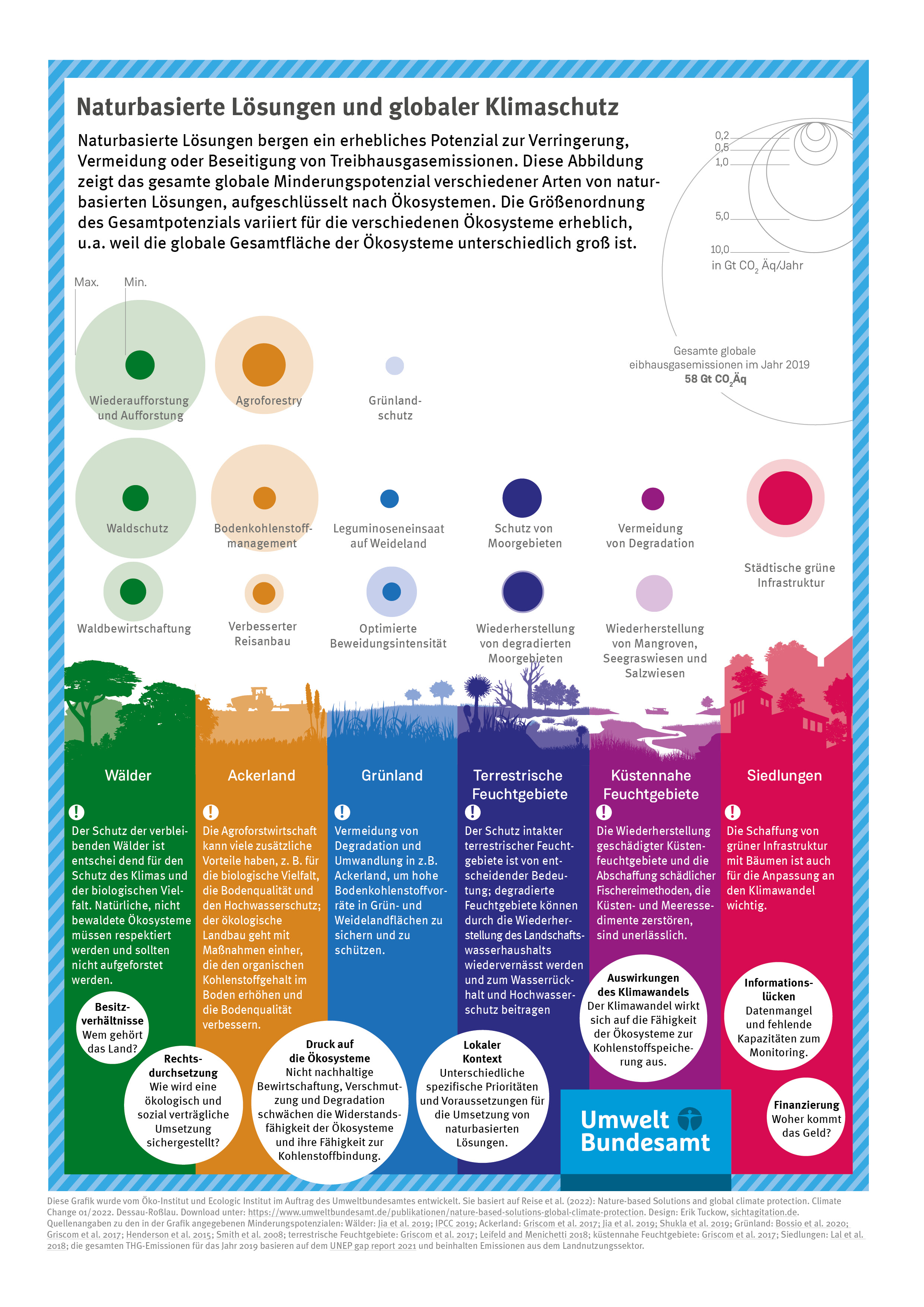 In der vom Umweltbundesamt beauftragten Studie „Role of soils in climate change mitigation“ (Frelih-Larsen et al., 2022) werden verschiedene Maßnahmen von klimafreundlicher Bodennutzung auf Übereinstimmung dieser Maßnahmen mit der Definition von NbS sowie deren Klimaschutzpotenzial hin untersucht. Die globalen Klimaschutzpotenziale von NbS-Maßnahmen für verschiedene Ökosysteme und deren ökologischen Einschränkungen werden in der vom UBA beauftragten Studie „Nature-based solutions and global climate protection“ (Reise et al., 2022) untersucht.