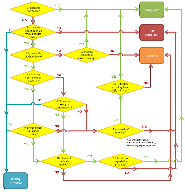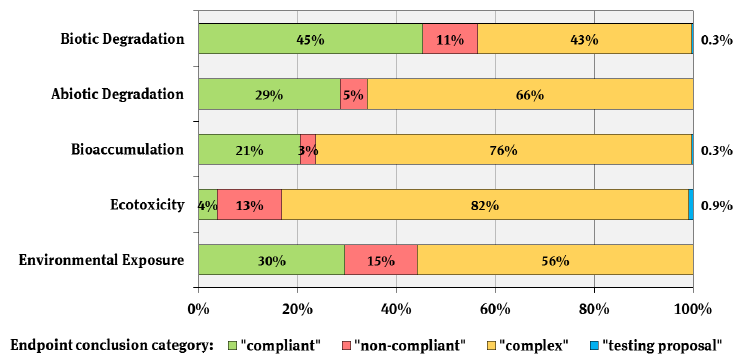 Die Entscheidungsbäume erlauben drei Entscheidungen für jede Anforderung. Die Daten können „konform“ oder „nicht konform“ mit den Maßgaben der REACH Verordnung sein. Als konform gilt eine erfüllte Anforderung dann, wenn valide Daten vorgelegt wurden. Nicht konform bedeutet, dass keine ausreichenden Informationen vorliegen. Die dritte Kategorie „komplex“ wurde genutzt, wenn die Begründung für einen Testverzicht nicht nachvollziehbar war, oder aus anderen Gründen (z.B. unklare Stoffidentität) eine Einzelfallprüfung erforderlich wäre, die in der Studie nicht geleistet werden konnte. In diesen Fällen lagen zumeist Ersatzdaten zu einem anderen, chemisch ähnlichen Stoff (häufig nach dem „Read-Across“-Ansatz) oder Begründungen für einen Datenverzicht („Waiving“) vor.