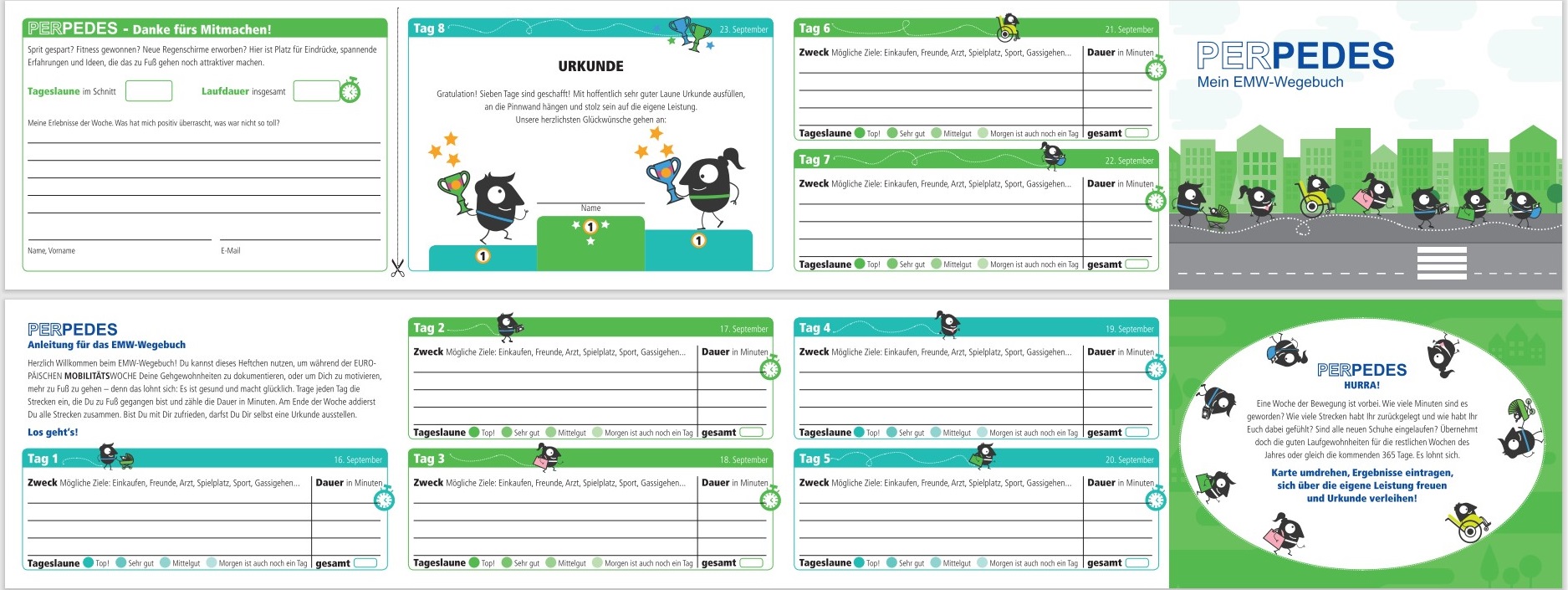 Es empfiehlt sich, das EMW-Wegebuch mit einer spezifischen Zielgruppe zu nutzen – zum Beispiel mit den eigenen Kolleginnen und Kollegen in der Stadtverwaltung. Alternativ wäre es auch denkbar die Aktion mit den Mitgliedern des Stadt- bzw. Gemeinderats oder mit Schülerinnen und Schülern der weiterführenden Schulen umzusetzen. Alle Teilnehmenden erhalten im Vorfeld der EMW ein EMW-Wegebuch. Innerhalb der sieben Aktionstage zählen alle ihre Gehminuten. Am Ende der Woche wird die Auswertungskarte abgegeben oder eingesammelt und im Anschluss ausgewertet. Unter allen Teilnehmenden können Preise verlost werden – für die sich erfahrungsgemäß gut Sponsoren finden lassen. Mit Hilfe der EMW-Designmaterialien können Urkunden für verschiedene Kategorien sowie Plakate zum Bewerben der Aktion erstellt werden.