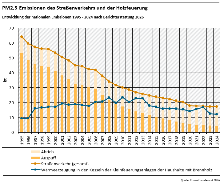 Insbesondere die Monate Februar und März waren im vergangenen Jahr von Episoden hoher Feinstaubbelastung (PM2,5) geprägt, u.a. mitverursacht durch grenzüberschreitenden Schadstofftransport. Die Höhe der Schadstoffbelastung wird auch von der Witterung beeinflusst. Ist es kalt, steigen die Emissionen, z. B. durch erhöhten Energie- und Heizbedarf. In kalten winterlichen Hochdruckwetterlagen, die häufig durch geringe Windgeschwindigkeiten und einen eingeschränkten vertikalen Luftaustausch geprägt sind, können sich die Schadstoffe in den unteren Luftschichten über Tage hinweg anreichern, was zu einer erhöhten Belastung führt. In diesen Episoden wären die neuen (ab 2030 anzuwendenden) Informationsschwellen für die Feinstäube PM2,5 (50 µg/m³ im Tagesmittel) und PM10 (90 µg/m³) überschritten worden. Der Luftqualitätsindex (LQI) wies für viele Tage eine schlechte oder sogar sehr schlechte Luftqualität aufgrund der PM2,5 -Konzentrationen aus. Auch auf die Belastung im Jahresmittel haben sich die ungünstigen Witterungsbedingen im Winter ausgewirkt. Die durchschnittlichen Jahresmittel für Feinstaub (PM10, PM2,5) und Stickstoffdioxid lagen 2025 über denen der Jahre 2023 und 2024. Das bedeutet jedoch keine Trendumkehr, da die Jahre 2023 und 2024 aufgrund günstiger Witterungsbedingungen unterdurchschnittlich belastet waren.