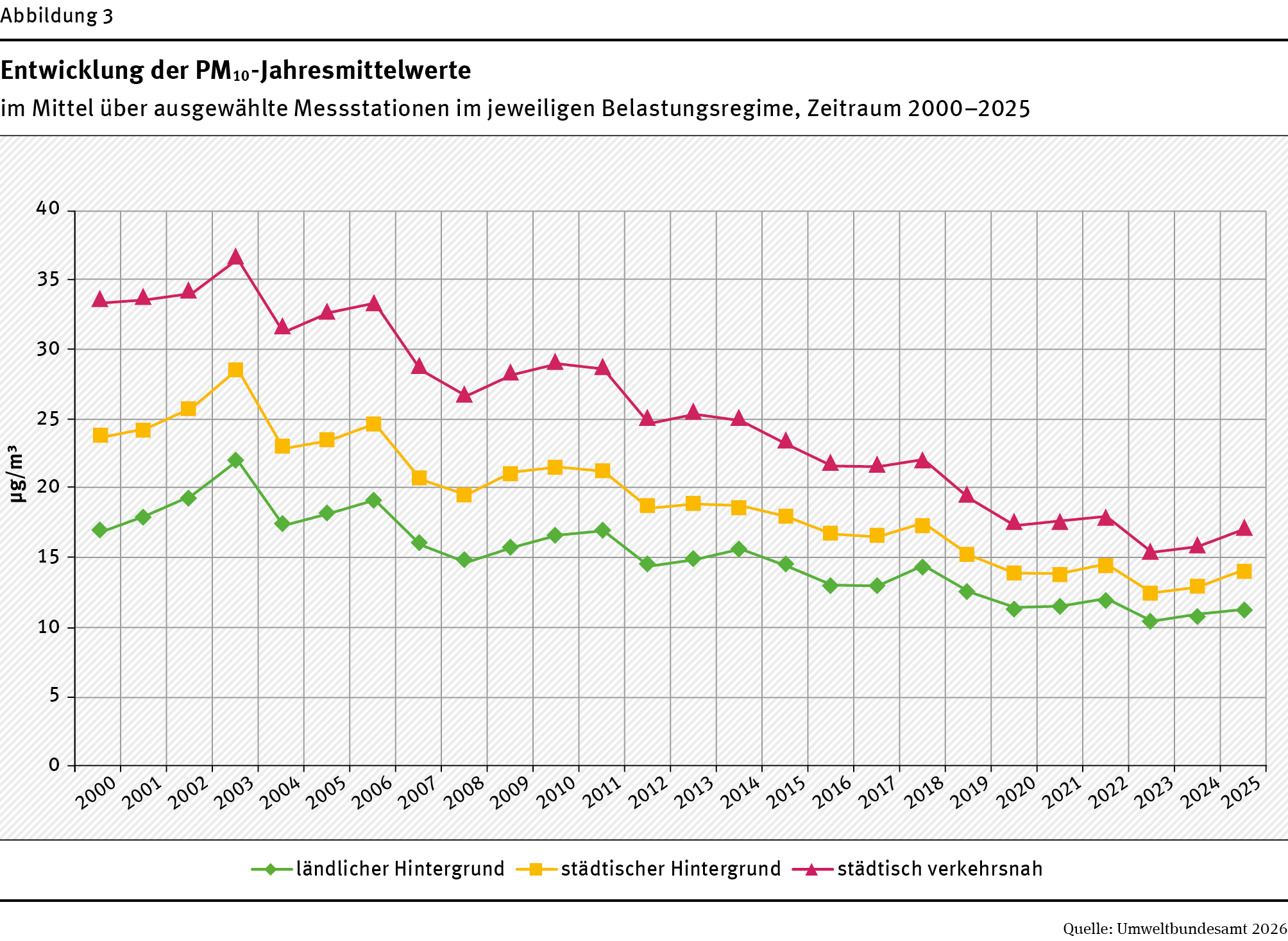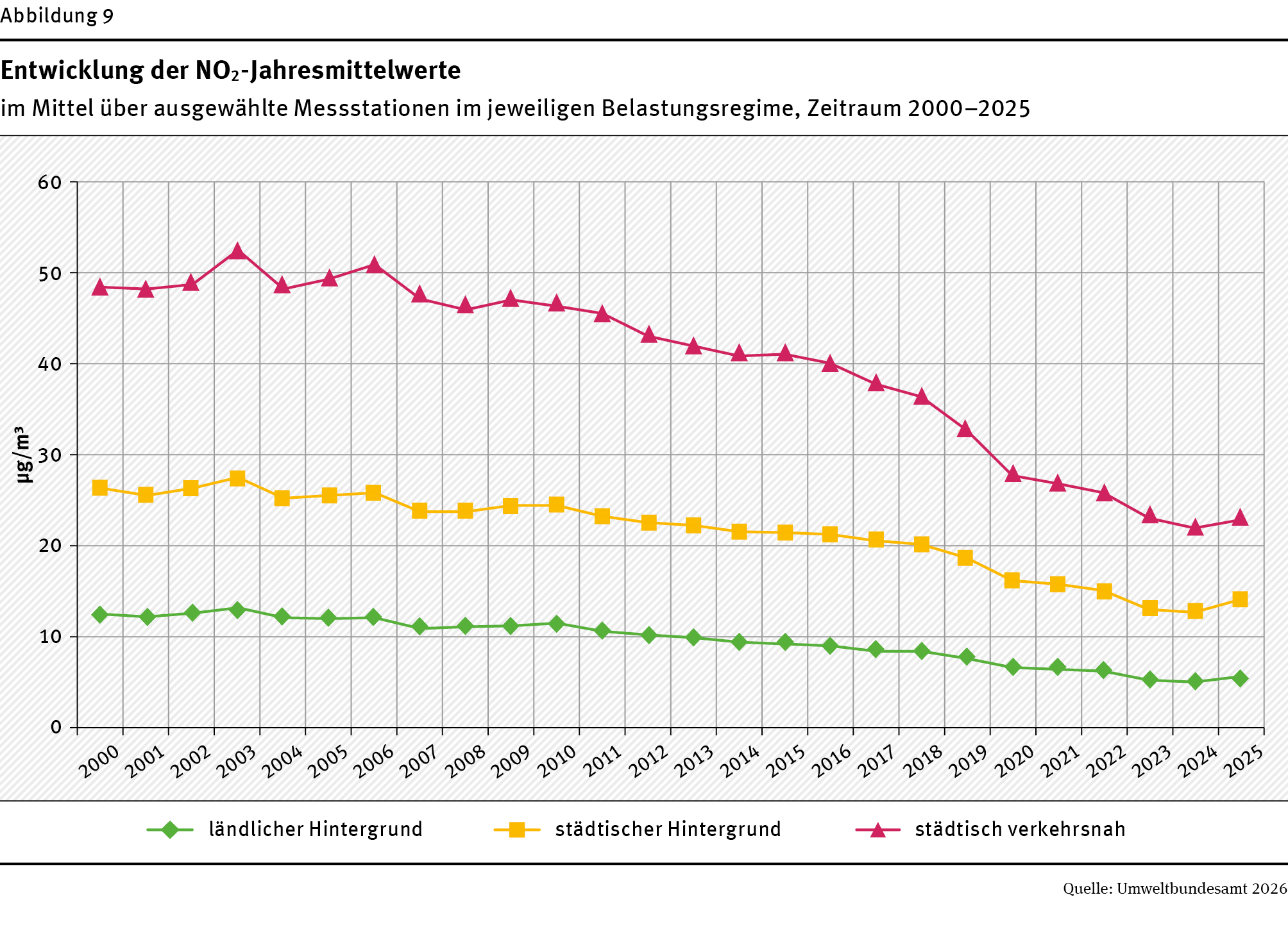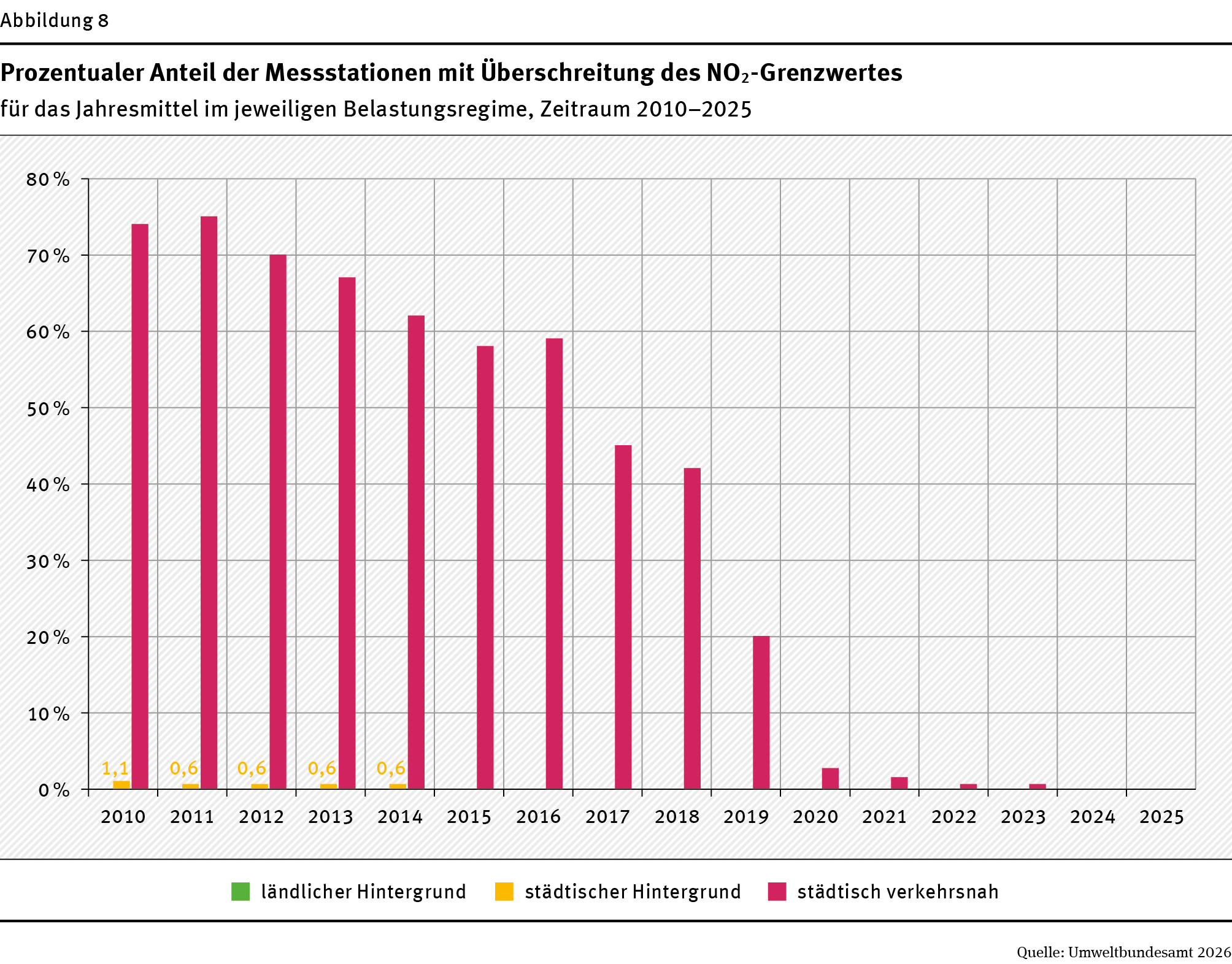 Die Auswertung basiert auf vorläufigen, noch nicht abschließend geprüften Daten aus den Luftmessnetzen der Bundesländer und des UBA, Stand 22.01.2026. Aufgrund der umfangreichen Qualitätssicherung in den Messnetzen stehen die endgültigen Daten erst Mitte 2026 zur Verfügung. Die zum jetzigen Zeitpunkt vorliegenden Daten lassen aber eine generelle Einschätzung des vergangenen Jahres zu.