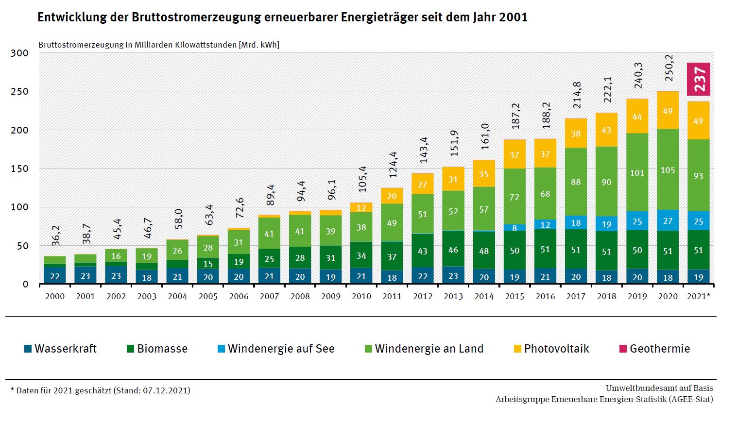 Entwicklung der erneuerbaren Stromerzeugung: Auf Basis vorliegender Daten schätzt die AGEE-Stat für das Gesamtjahr 2021 eine Stromerzeugung aus erneuerbaren Energien von etwa 237 Milliarden Kilowattstunden (Mrd. kWh). Dies entspricht einem Rückgang um etwa fünf Prozent gegenüber dem Vorjahr (250 Mrd. kWh). Da gleichzeitig der Stromverbrauch gegenüber dem besonders von der Covid19-Pandemie gezeichneten Jahr 2020 wieder anzog, fiel der Anteil des erneuerbaren Stroms deutlich von 45,3 Prozent im Jahr 2020 auf geschätzte 42 Prozent im Jahr 2021.