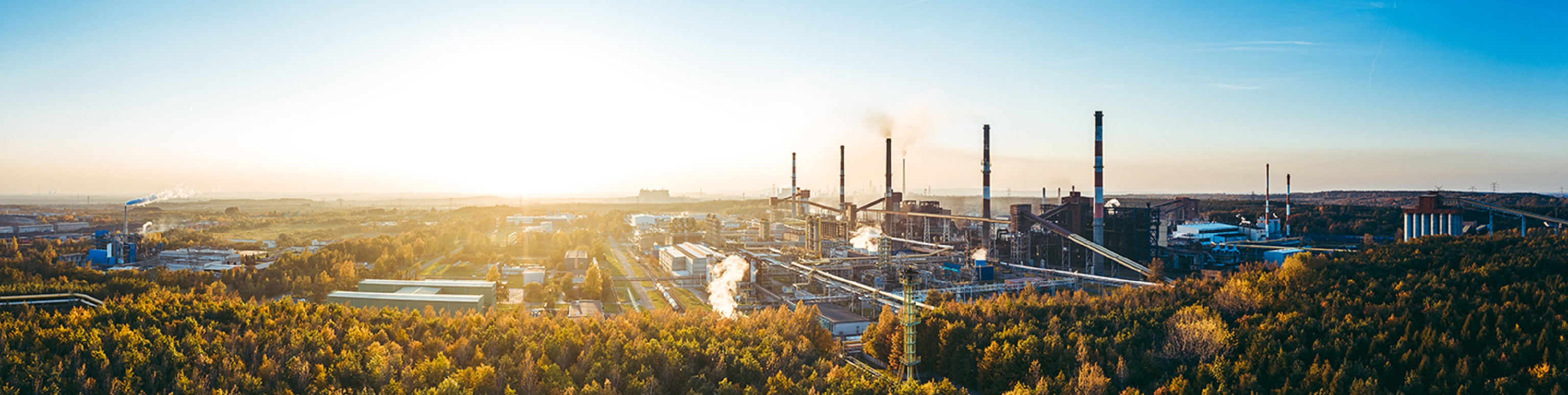 Das Bild zeigt eine Fabrik mit fünf Schornsteinen umgeben von Wald.