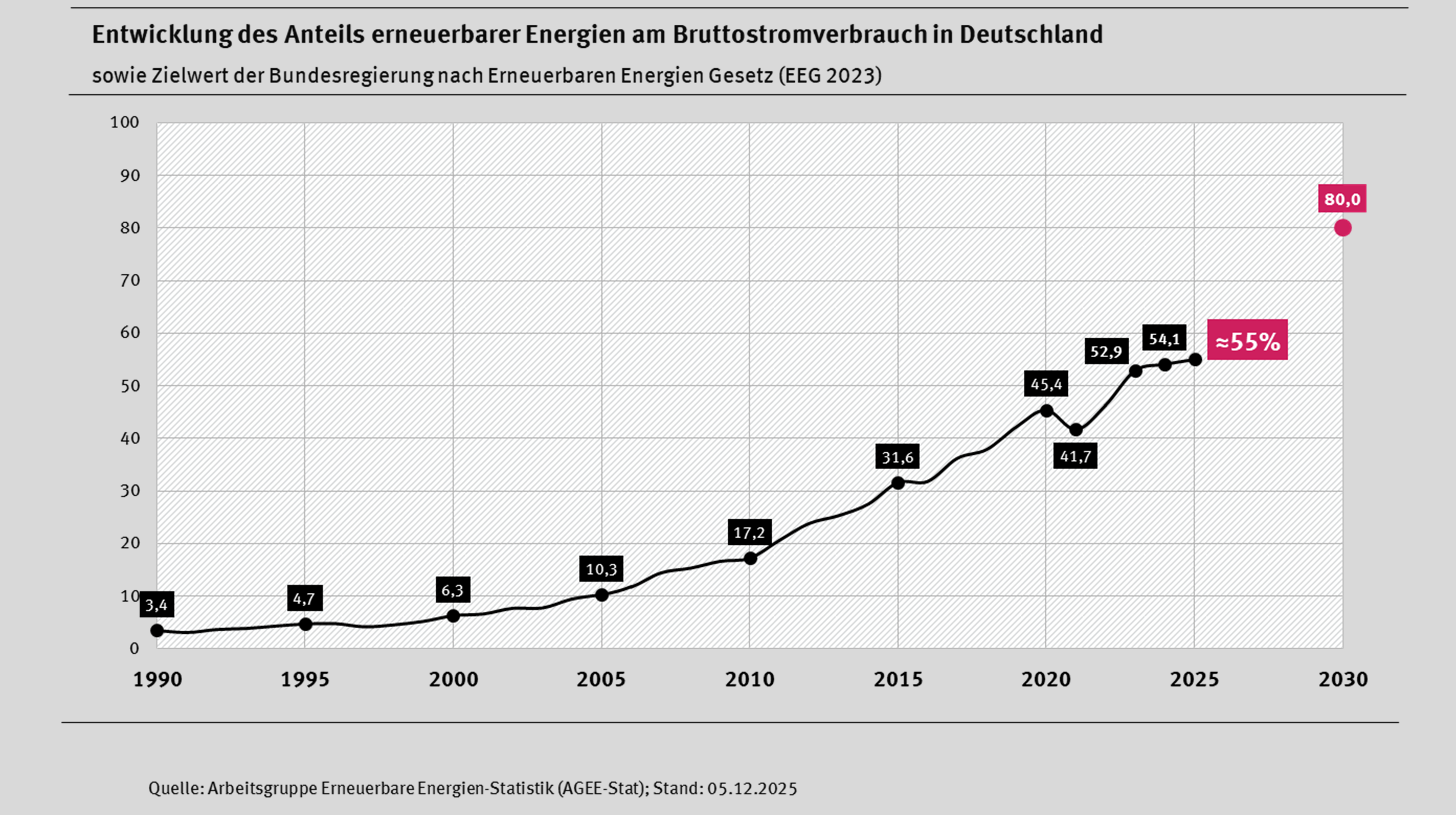 „Grundsätzlich sind wir auf dem richtigen Weg. Die erneuerbare Stromerzeugung zeigt ein kontinuierliches Wachstum“, sagt Dirk Messner, Präsident des Umweltbundesamtes. „Doch für das Ziel, 80 Prozent des Bruttostromverbrauchs im Jahr 2030 aus erneuerbaren Quellen zu decken, muss der Ausbau weiter beschleunigt werden. Es bleibt entscheidend, das Ausbautempo durch verlässliche und geeignete Rahmenbedingungen hoch zu halten.“
