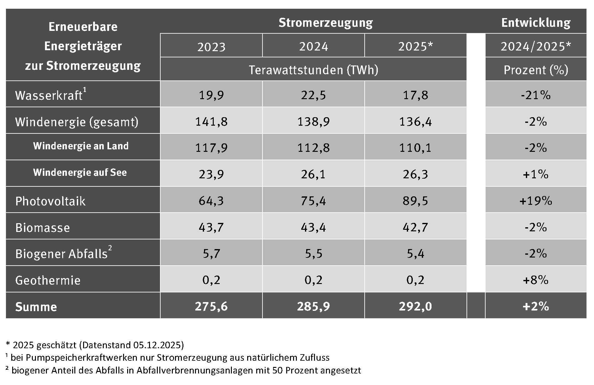 Die deutsche Bruttostromerzeugung aus erneuerbaren Energien wird 2025 mit voraussichtlich 292 Terawattstunden (TWh) etwa 2 Prozent über der Erzeugung des Vorjahres liegen. Das teilte die Geschäftsstelle der Arbeitsgruppe Erneuerbare Energien-Statistik (AGEE-Stat) am Umweltbundesamt (UBA) heute mit. Der Anteil erneuerbarer Energien am wieder anziehenden Bruttostromverbrauch steigt damit leicht auf rund 55 Prozent. In den letzten Jahren lag der Anteil bei 54,1 Prozent (2024) und 52,5 Prozent (2023).