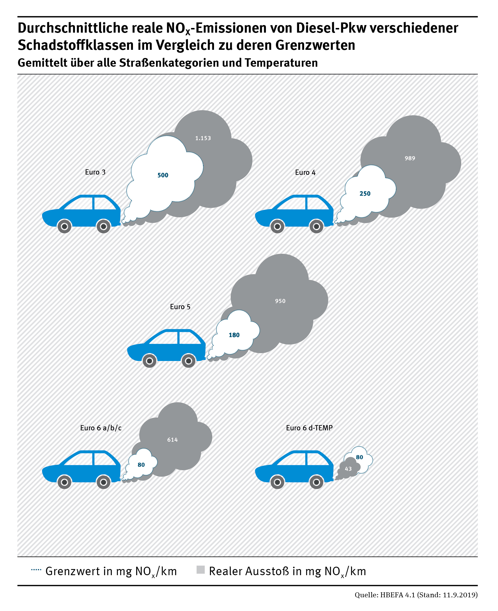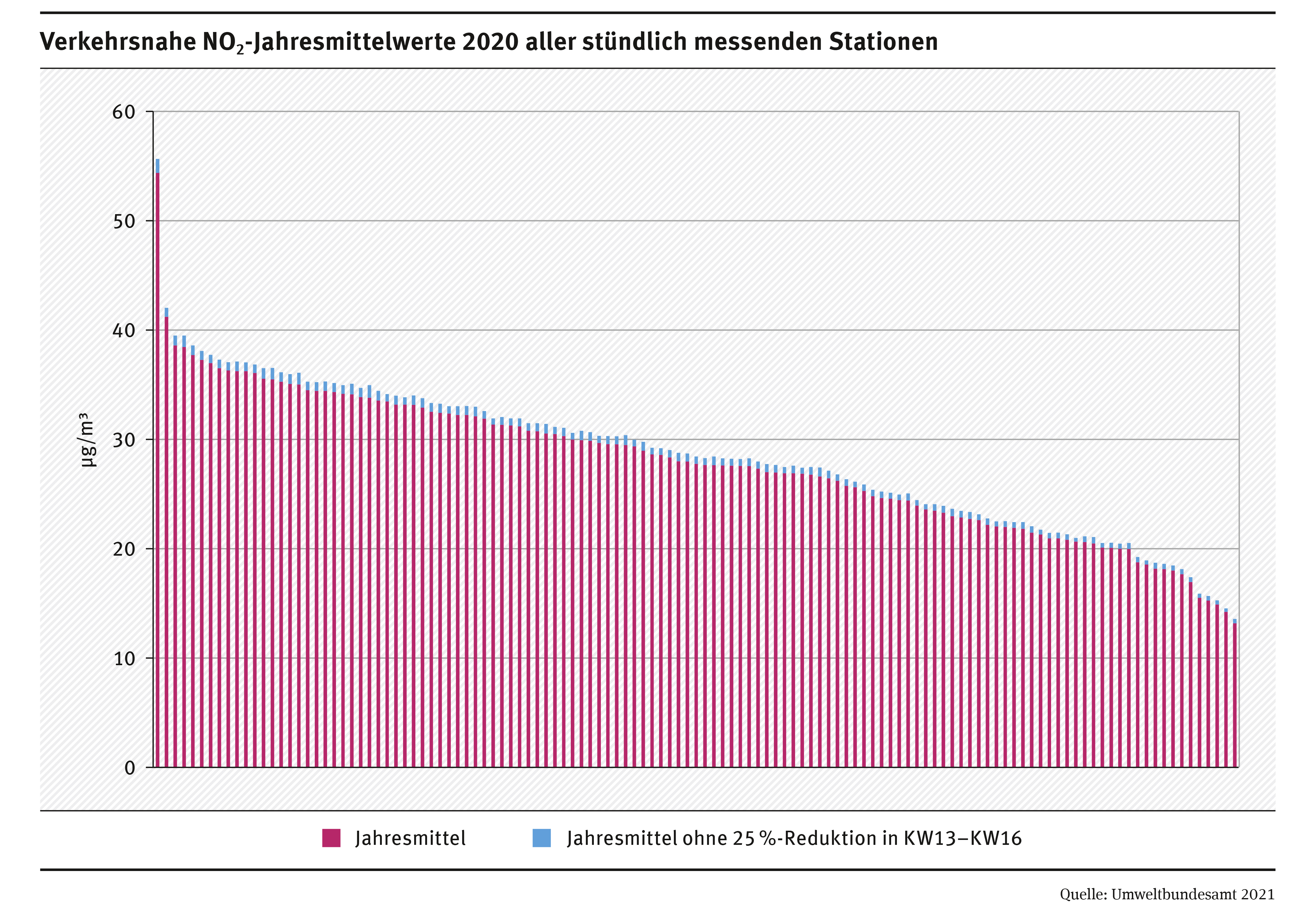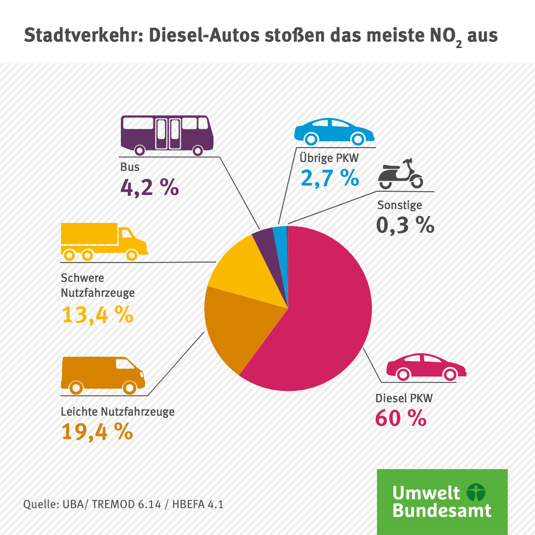 Hauptquelle der Stickstoffoxide in Städten ist der Straßenverkehr und hier sind es vor allem Diesel-Pkw. Überschreitungen des NO₂-Grenzwertes traten und treten daher ausschließlich an viel befahrenen Straßen in Ballungsräumen und Städten auf. An sieben der insgesamt 250 verkehrsnahen Messstationen überschritten die NO₂-Konzentrationen im Jahr 2020 den Grenzwert von 40 µg/m³ im Jahresmittel. Im Jahr 2019 war dies noch an 51 Messstationen der Fall.
