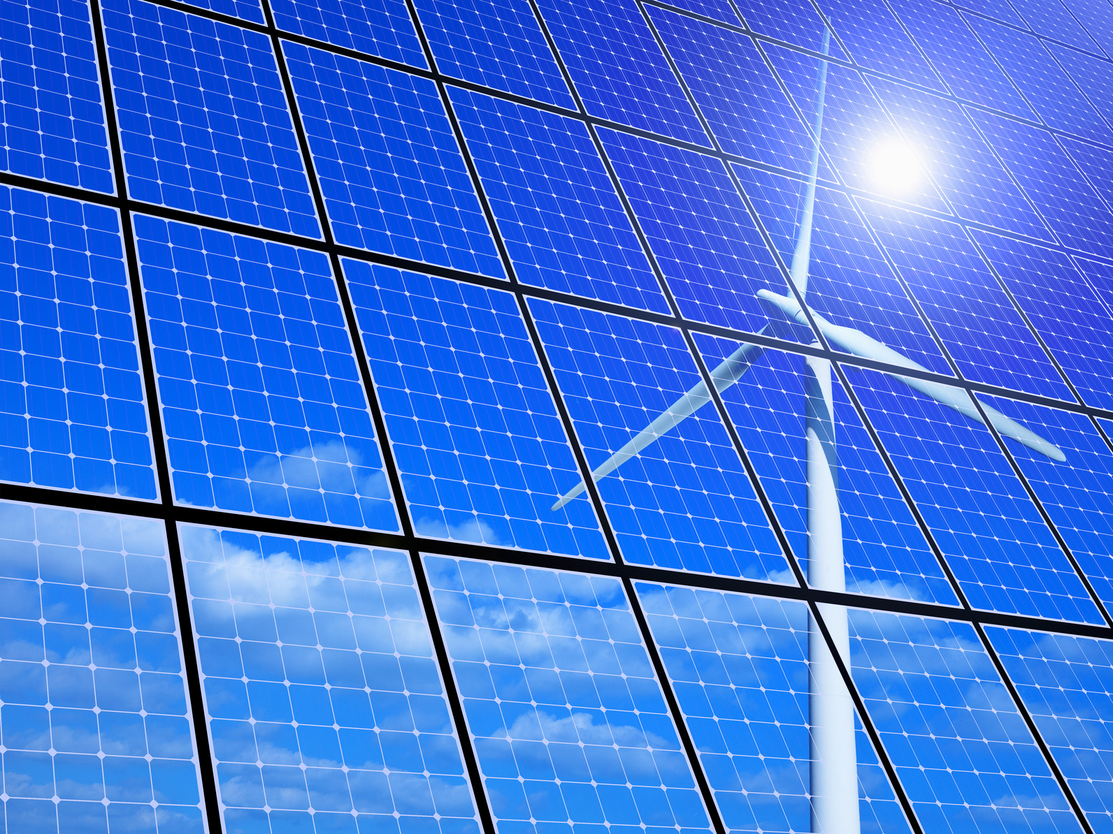 eine Windkraftanlage, die Sonne und Schönwetterwolken an einem blauen Himmel spiegeln sich in Solarzellen
