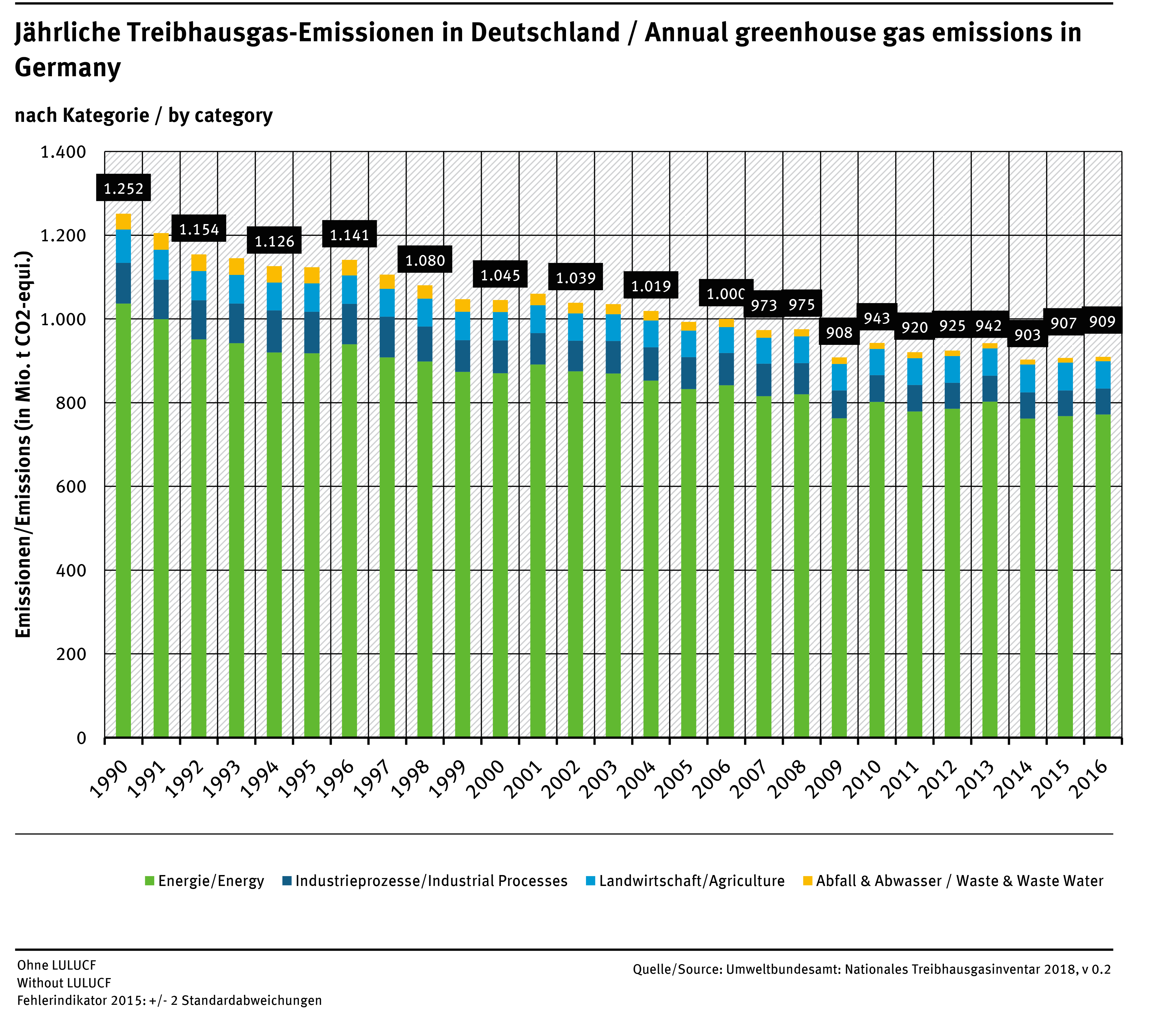 Die größten CO2-Minderungen gab es mit 4,6 Millionen Tonnen in der Energiewirtschaft, obwohl die Stromexporte gestiegen sind. Der Energiesektor macht mit 332,1 Millionen Tonnen im Jahr aber immer noch den Großteil der Emissionen aus (36,5 Prozent). „Wenn wir im Klimaschutz schnell etwas erreichen wollen, dann müssen wir uns um die Kohleverstromung kümmern. Ich rate weiter dazu, Braun- und Steinkohlekraftwerke, die älter als 20 Jahre sind, nur noch mit maximal 4.000 Volllaststunden pro Anlage pro Jahr laufen zu lassen. Zudem sollten mindestens 5 Gigawatt der ältesten und ineffizientesten Braunkohlekraftwerke ganz stillgelegt werden.“, so Krautzberger. “Auch für unsere Klimaziele bis 2030 ist entscheidend, dass die Energiewirtschaft einen großen Teil der Reduktion schultert. Das geht nur, wenn wir schnell mit der Stilllegung von älteren bzw. ineffizienten Braun- und Steinkohlekraftwerken anfangen. Sonst besteht die Gefahr, dass wir nicht nur unsere Klimaziele für 2020 verpassen, sondern auch zum Ende des nächsten Jahrzehnts erneut in Schwierigkeiten kommen.“ In 2016 hat Deutschland seine Emissionen nur um 27,3 Prozent gegenüber 1990 senken können; ursprünglich hatte die Bundesregierung für 2020 eine Minderung von 40 Prozent angestrebt, die voraussichtlich deutlich verfehlt werden wird.